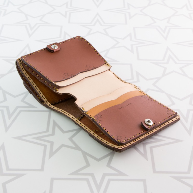 柔らかなカーブを描いたディティールと、繊細なステッチワークが秀逸な八芒星のショートウォレットです。外側に付いたコインケース部分は小銭が見やすい大きめな作りになっており、カードケースはたくさんのカードの収納が出来るよう、マチが付いております。使い込むほど味がでてくる革ならではの風合いを楽しめます。※商品のDカンはオプションで取り付け可能です。実際の商品にはDカンは含まれません。Dカン取り付けのご注文はこちらから↓https://szhotelkc.com/products/detail/15871?category_id=取り付けイメージhttps://szhotelkc.com/products/detail/17448?category_id=カラーバリエーションも豊富に展開中!お気に入りのカラーをお探し下さい↓https://szhotelkc.com/products/list/394その他のショートウォレットはこちらから↓https://szhotelkc.com/products/list/143ロングウォレットをお探しの方はこちら↓https://szhotelkc.com/products/list/144※写真掲載の小物は含まれません。