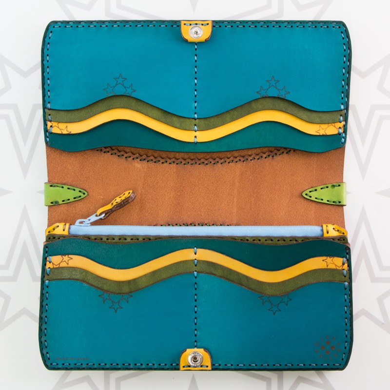 柔らかなカーブを描いたディティールと、繊細なステッチワークが秀逸な八芒星のロングウォレットです。ファスナータイプのコインケースと豊富なカードスペースで使いやすい仕上がりとなりました。カードスペースはカーブを描いており、内側のカラーとディティールにも拘りデザインしています。※商品のDカンはオプションで取り付け可能です。