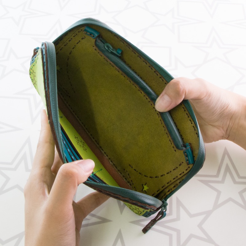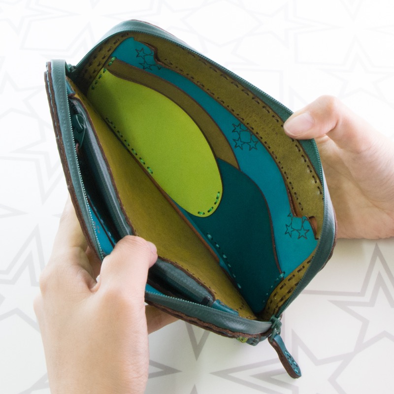 丸みを帯びた折り重なるポケットや弧を描くカット、コインケースに隠れた五芒星など、中のデザインにも遊び心を取り入れたオジャガデザインらしい仕上がりです。