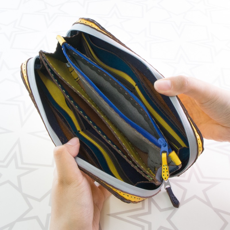 大きく開くダブルジップで中が見やすく、カードポケットが16箇所、ポケットが3箇所、中仕切りが2つ付き、コインケースはたっぷり入るジップタイプで収納力抜群の仕上がりになりました。