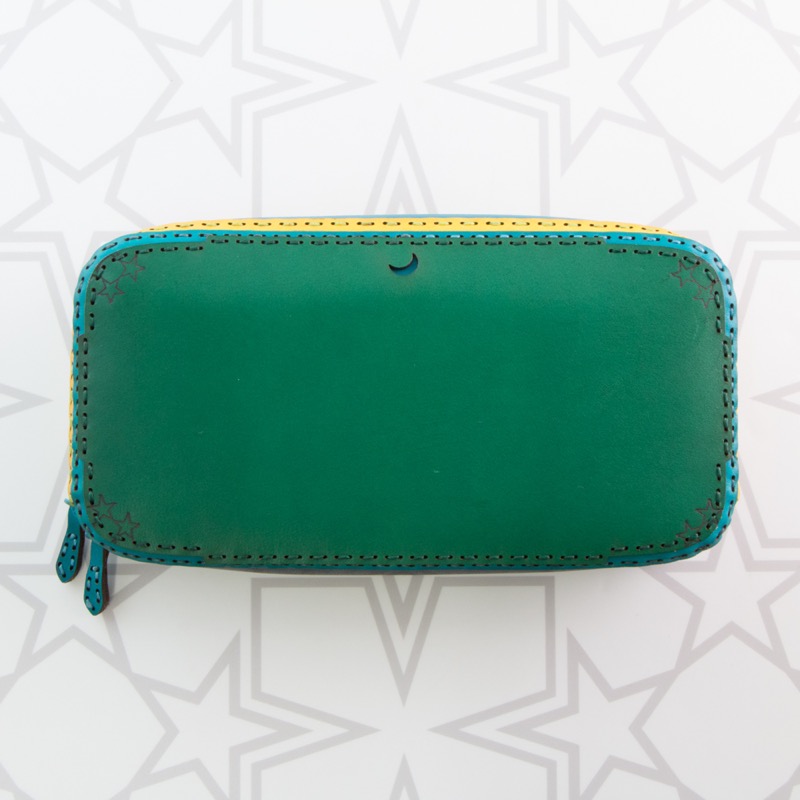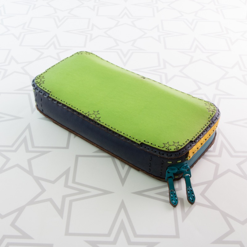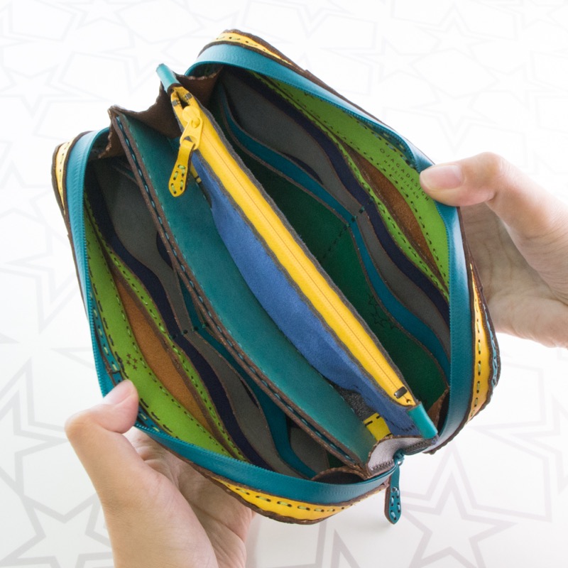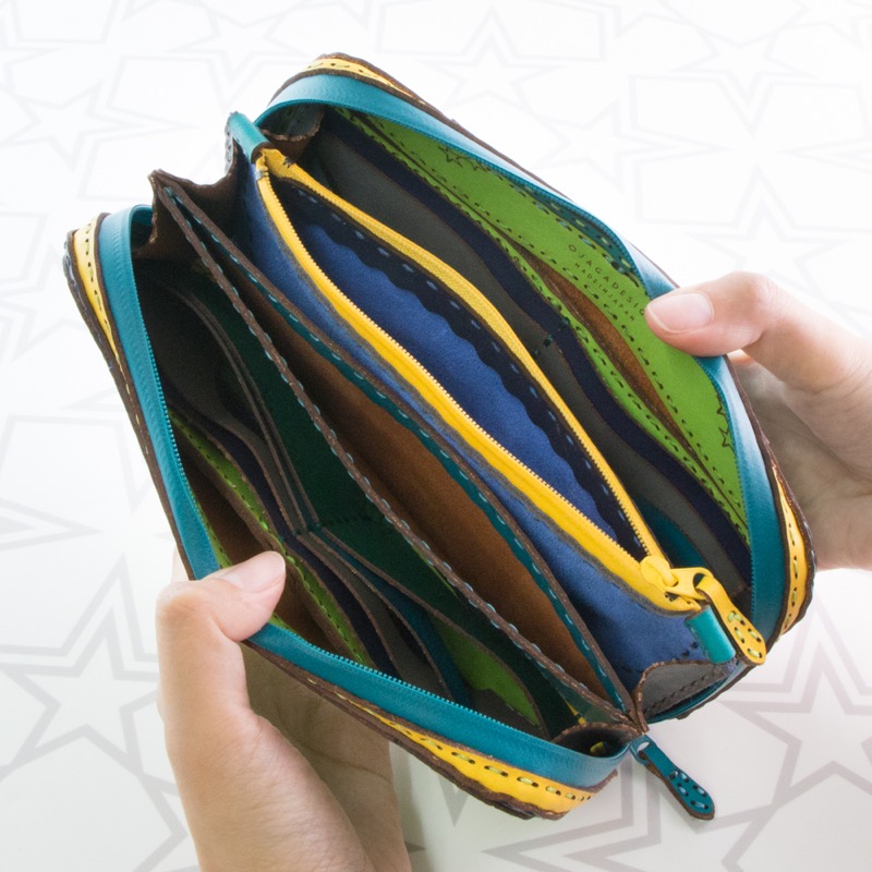 大きく開くダブルジップで中が見やすく、カードポケットが16箇所、ポケットが3箇所、中仕切りが2つ付き、コインケースはたっぷり入るジップタイプで収納力抜群の仕上がりになりました。