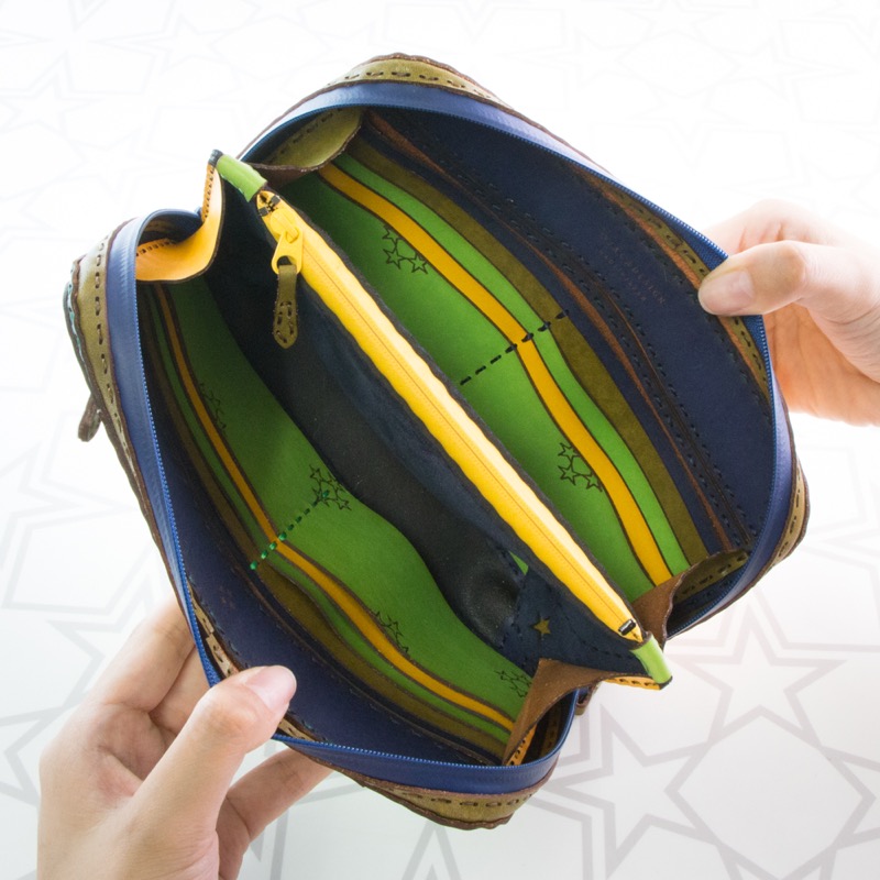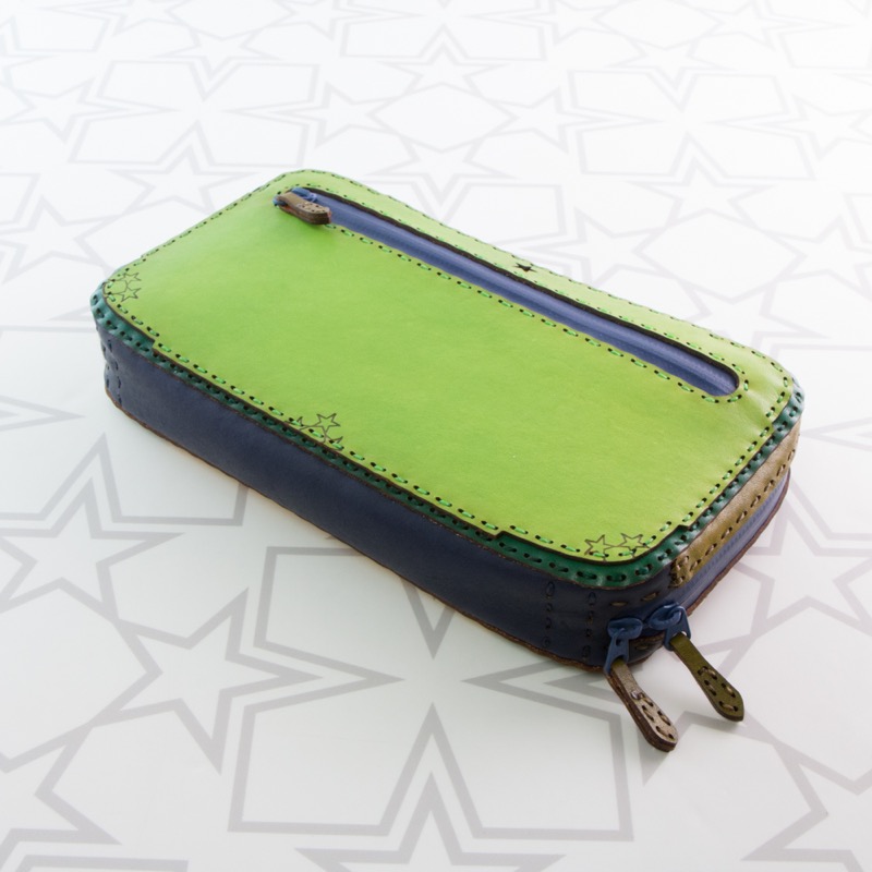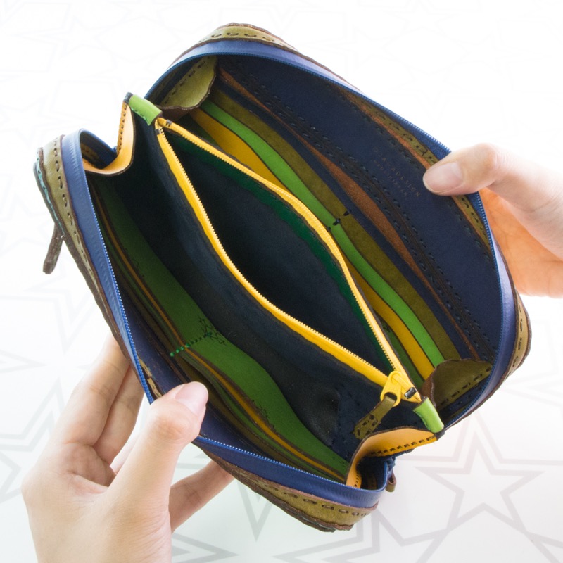 大きく開くダブルジップで中が見やすく、カードポケットが16箇所、ポケットが3箇所、コインケースはたっぷり入るジップタイプ、表にもジップのポケットが付いて収納力抜群の仕上がりになりました。