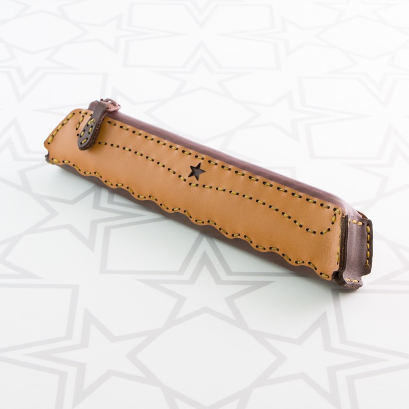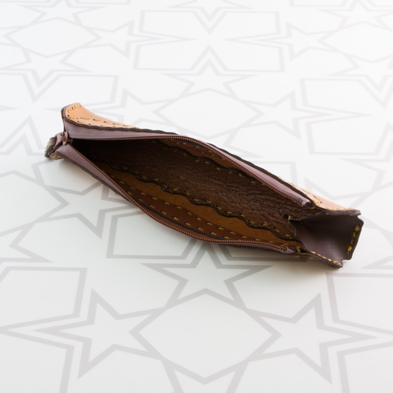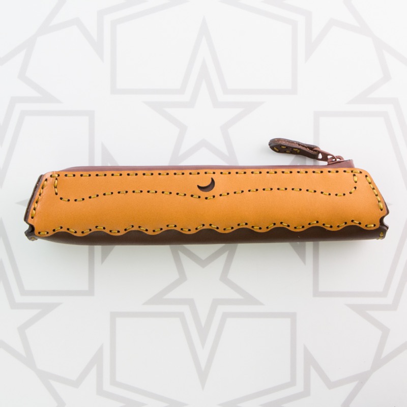 ジップタイプのペンケースがです。バッグの中で邪魔にならないコンパクトなサイズで、数本持ち歩きたい方にぴったりのスッキリとしたデザインになりました。ボールペンが約5本入り、大きく開くジップタイプなので中も見やすい作りとなっております。小さな月星と波型カットでオジャガデザインらしい仕上がりです。