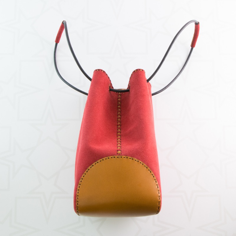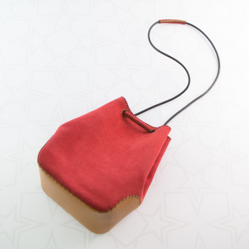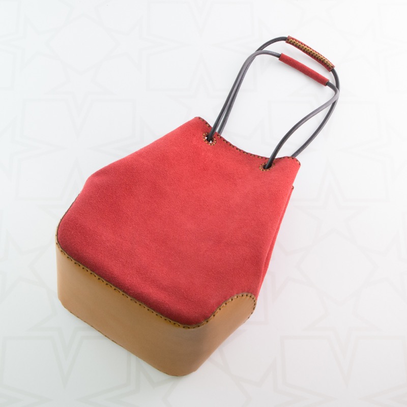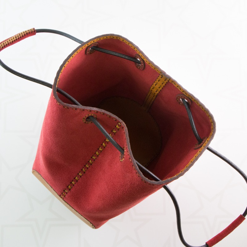 巾着型のミニバッグです。本体は柔らかなスエードを使用することで口が大きく開いて中身がとても見やすく、底面には牛革を使用し、ボックス型のような個性的なフォルムに仕上がりました。革紐を1本で持つと肩掛けに、2本で持つとハンドバッグになる2WAY仕様で便利にお使いいただけます。バッグ本体はあえてシンプルなデザインで仕上げ、サイドや持ち手部分のクロスステッチ、バッグの口のパイピングなど、細かな部分にさりげないワンポイントを盛り込みました。キーホルダーや既存のタッセルチャームとの組み合わせもおすすめです。