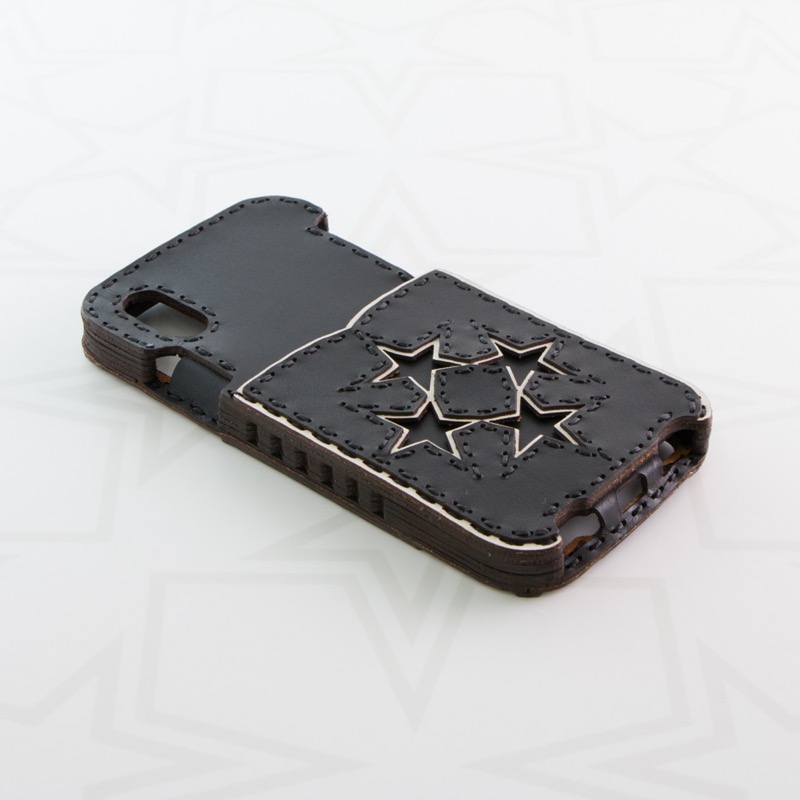 シンプルなデザインのiPhone X / XSケースです。ポケット付きのケースにOJAGA STARをデザインしました。サイドのマチ部分にもさりげなくデザインが入りました。マチまでレザーで仕上げることで保護性が高くなるだけでなく、長く使うことで手にしっくりと馴染みます。※お使いの充電器によってはワイヤレス充電機能がお使いいただけない場合がございます。予めご了承下さい。