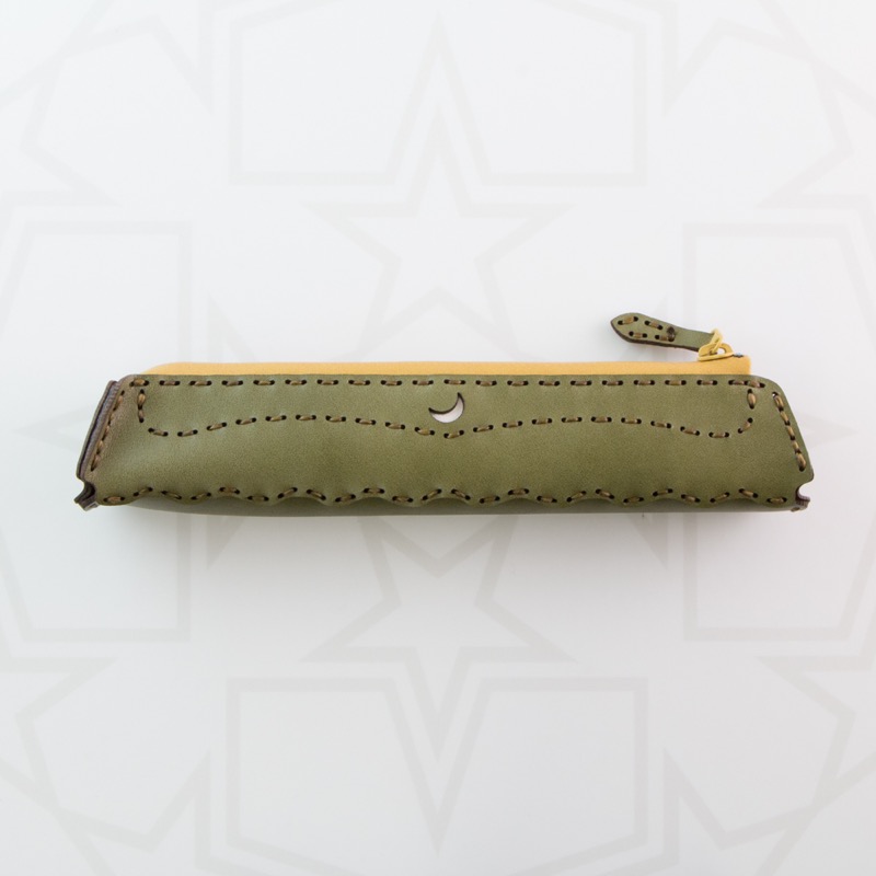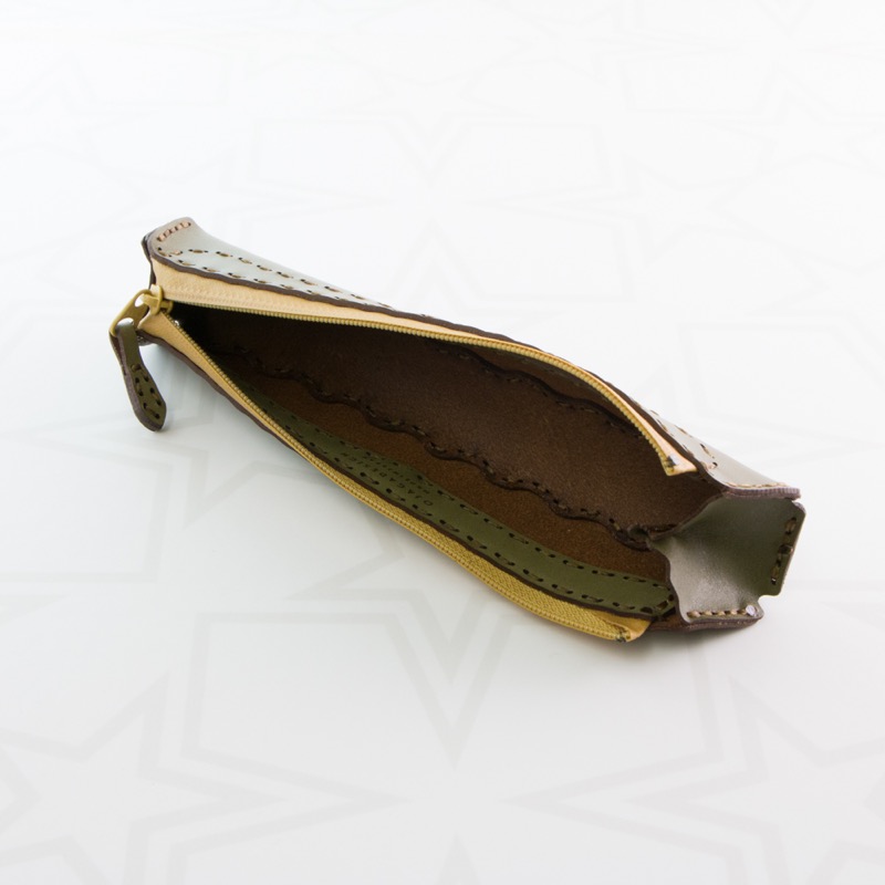 ジップタイプのペンケースがです。バッグの中で邪魔にならないコンパクトなサイズで、数本持ち歩きたい方にぴったりのスッキリとしたデザインになりました。ボールペンが約5本入り、大きく開くジップタイプなので中も見やすい作りとなっております。小さな月星と波型カットでオジャガデザインらしい仕上がりです。
