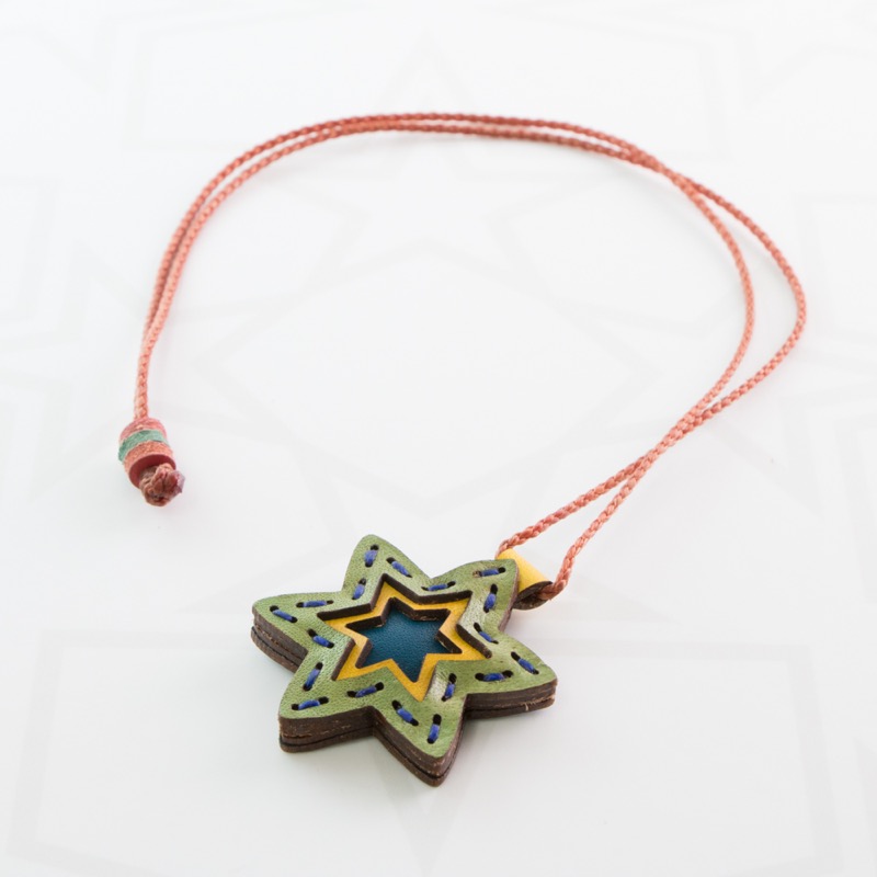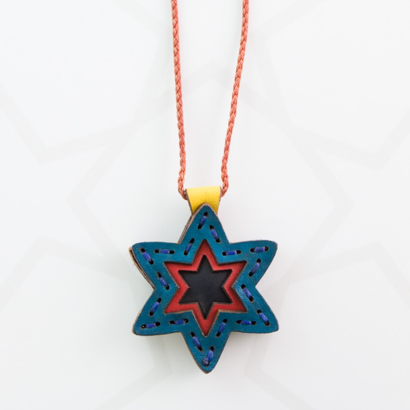 六芒星をデザインしたネックレスです。三枚の革を重ねた存在感のある仕上がりは、ファッションのアクセントに最適です。表裏それぞれ異なったカラーリングなので、リバーシブルでお楽しみ頂けます。紐部分のレザービーズで紐をお好みの長さに調整出来る仕様となっております。