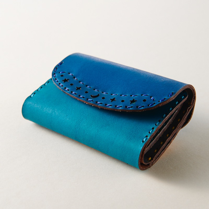 大きく開く二ヶ所のポケットに月と星がデザインされた可愛いデザインが特徴のミニウォレット。外側に付いた使いやすいコインケース部分、内側にはお札入れの他に、3箇所のカード収納スペースがあり、カードケースのようにコンパクトサイズながら使い易く収納力に優れたミニウォレット。電子マネー時代に合ったコンパクトさが魅力なアイテムとなっております。
