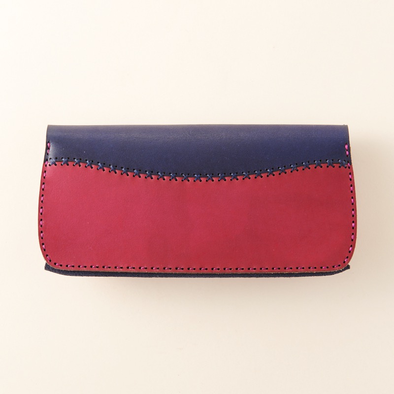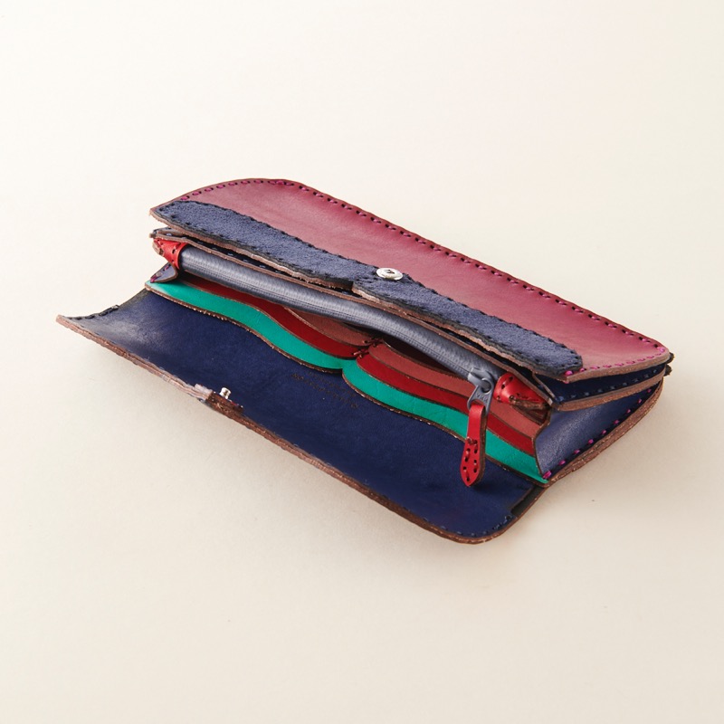 コインが沢山入るファスナータイプのコインケースと、フタ部分と同様に緩やかなカーブの切込みに色彩豊かなカードスペースは、財布を開けるのが楽しくなる仕上がりとなりました。