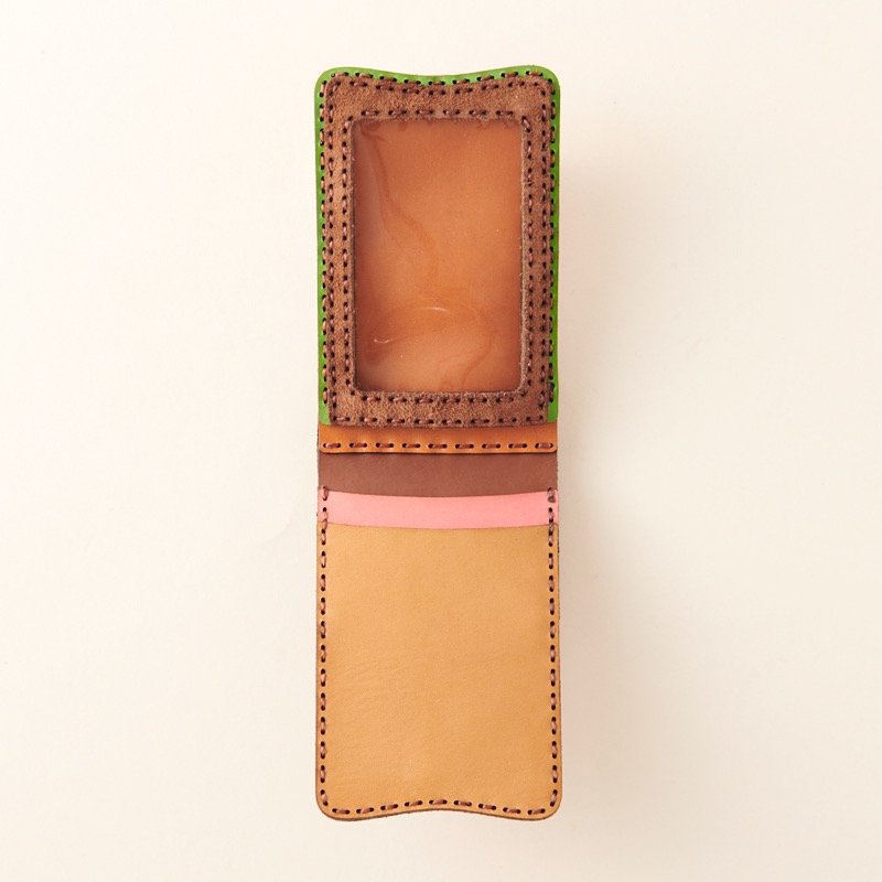 シンプルでツートーンカラーのアクセントが魅力の折りたたみタイプのパスケース。窓付きのカードケースとポケットが二箇所付いており、透明窓の部分には免許書、社員証、写真などを入れるのを便利です。手のひらに収まる小さなサイズながら、大きく開き、両サイドに配置されたカード入れが見やすくて使い勝手の良い仕様なっております。シンプルで飽きのこないデザインなので、長くご愛用いただけます。