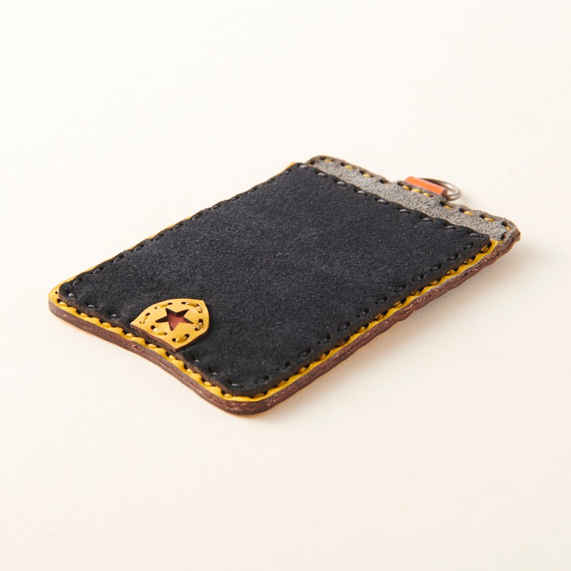 質感が良いスエードを使ったコンビネーションデザインのパスケースです。前面には五芒星をさりげなく配置したシンプルなデザインになっておりカードの出し入れもしやすくなっております。裏面に付いたリングにはチェーンやストラップを付けられるので、通勤・通学に便利なアイテムです。