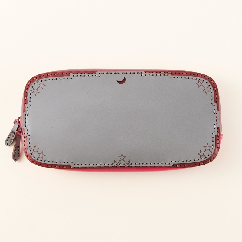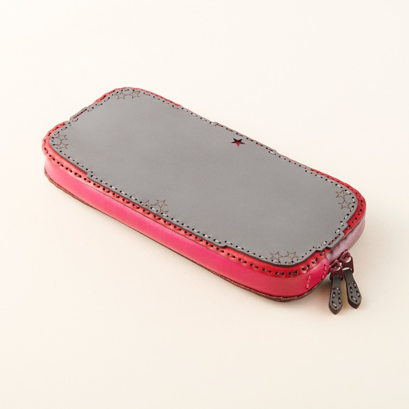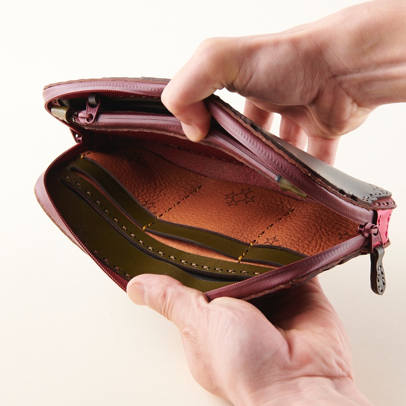 丸みを帯びた折り重なるポケットや弧を描くカット、コインケースに隠れた五芒星など、中のデザインにも遊び心を取り入れたオジャガデザインらしい仕上がりです。
