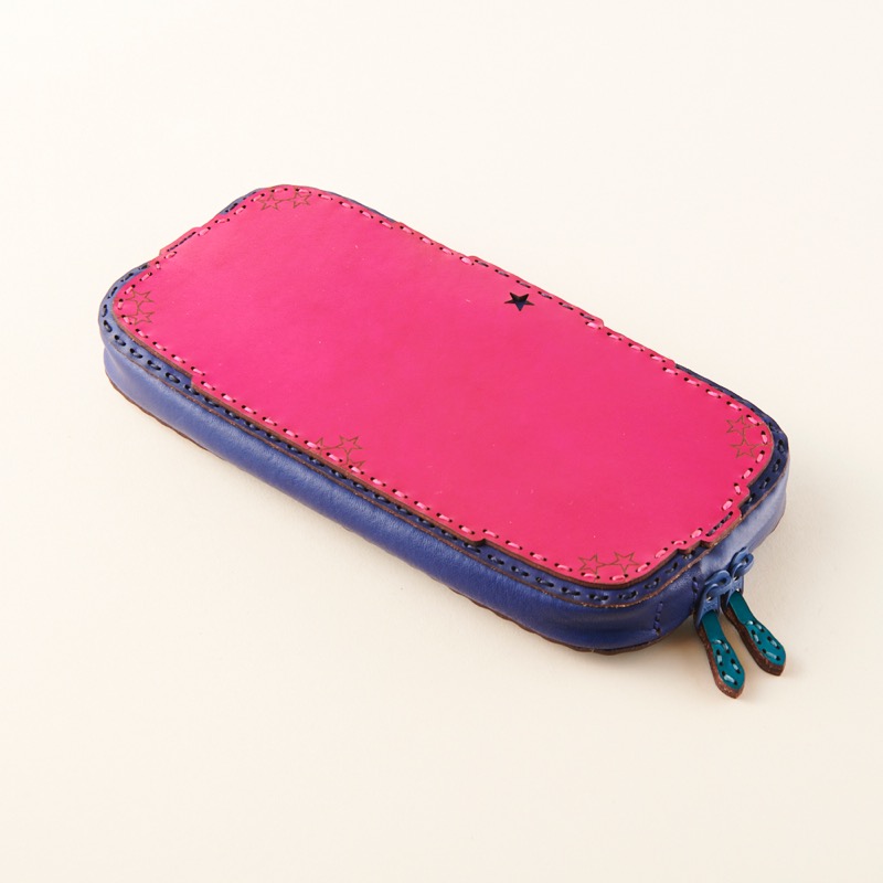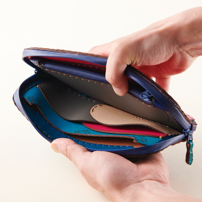 丸みを帯びた折り重なるポケットや弧を描くカット、コインケースに隠れた五芒星など、中のデザインにも遊び心を取り入れたオジャガデザインらしい仕上がりです。