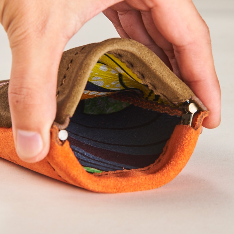 表面のシンプルなデザインの裏地にはアフリカンファブリックを使用した可愛い模様が入っており、大事なメガネやサングラスをやさしく守ってくれます。