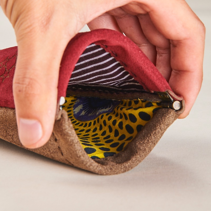 表面のシンプルなデザインの裏地にはアフリカンファブリックを使用した可愛い模様が入っており、大事なメガネやサングラスをやさしく守ってくれます。