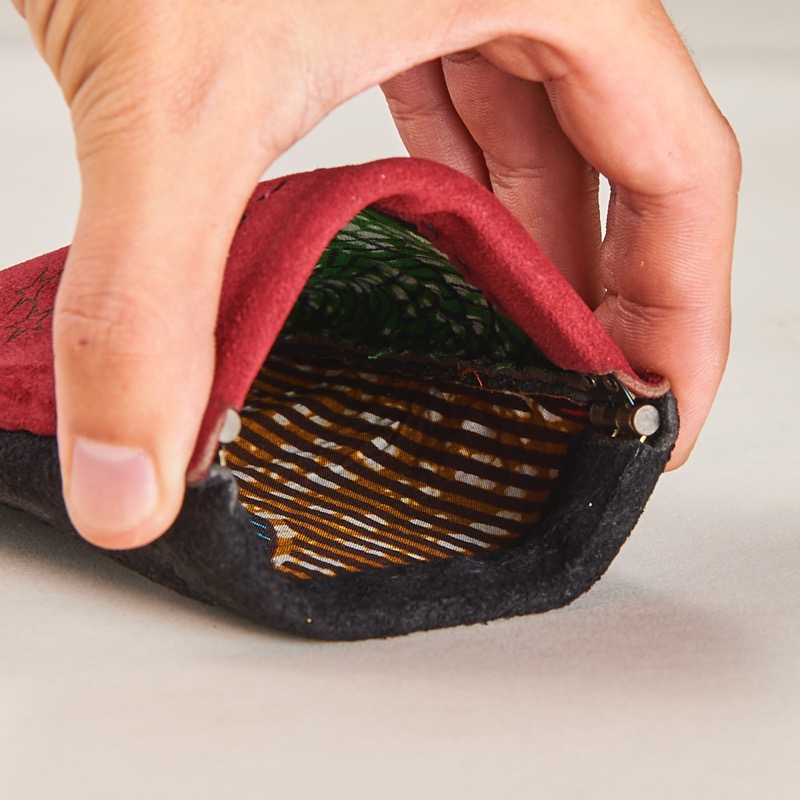 表面のシンプルなデザインの裏地にはアフリカンファブリックを使用した可愛い模様が入っており、大事なメガネやサングラスをやさしく守ってくれます。