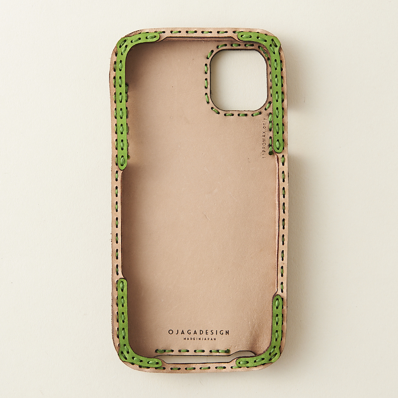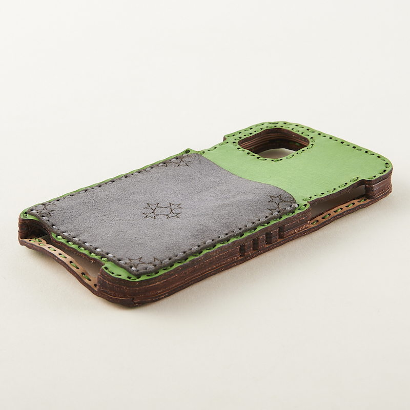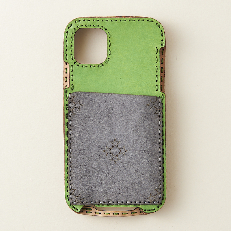 背面を一枚の革で仕上げ、スエード素材のカードポケットにオジャガスターを配置したシンプルなデザインです。
