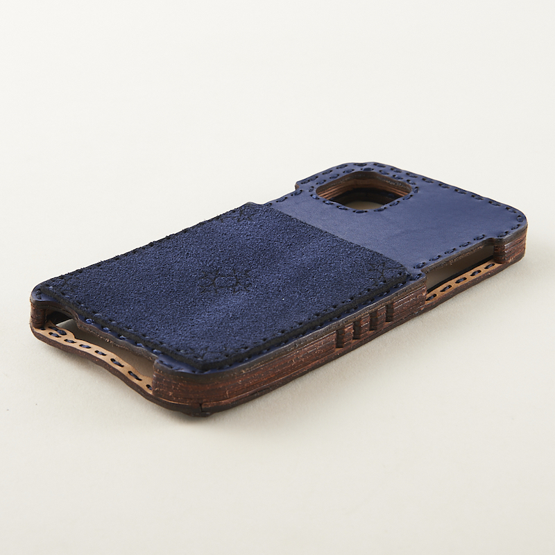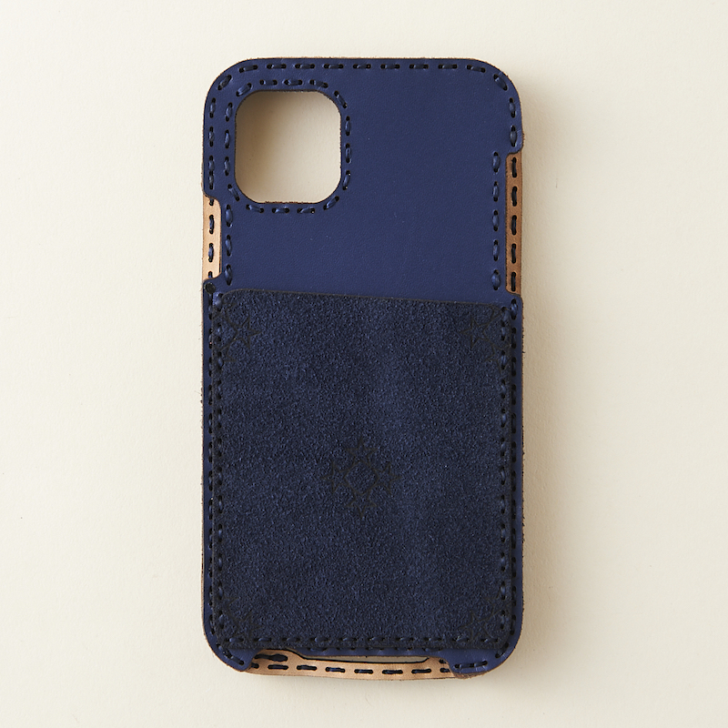 背面を一枚の革で仕上げ、スエード素材のカードポケットにオジャガスターを配置したシンプルなデザインです。