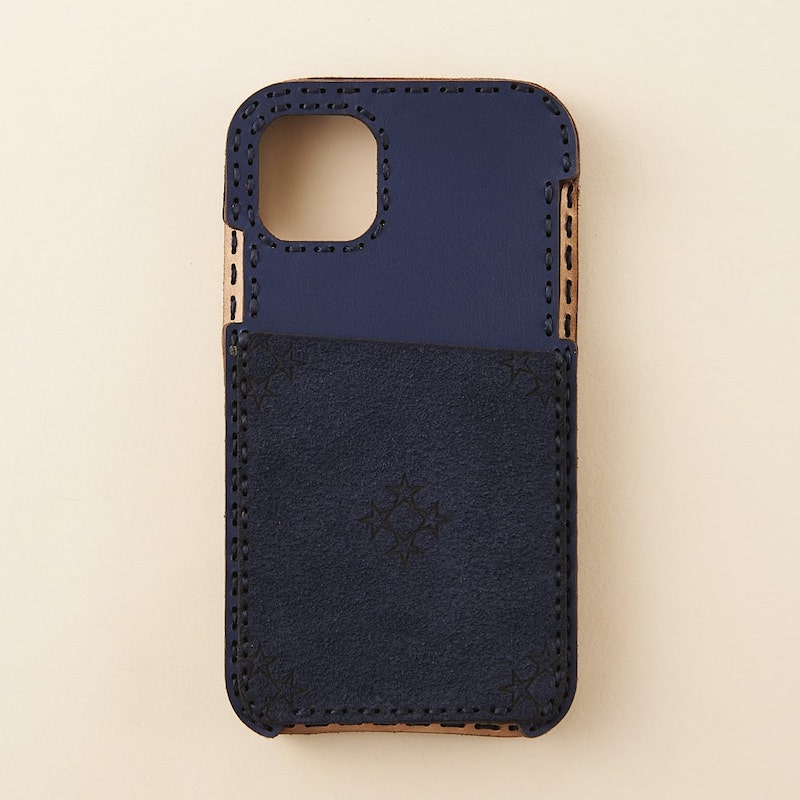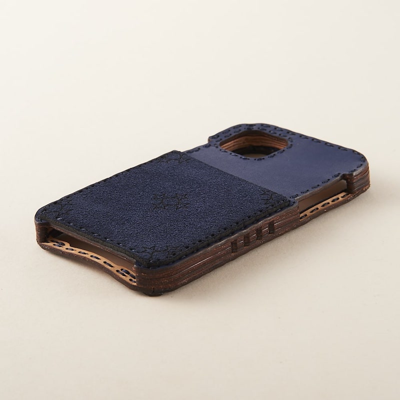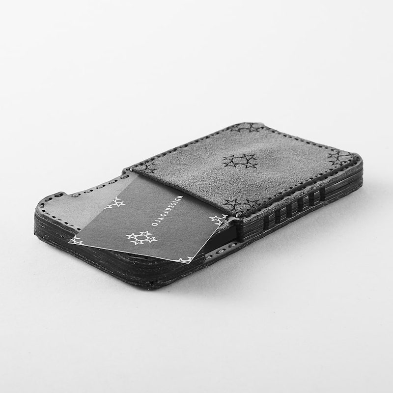 背面を一枚の革で仕上げ、スエード素材のカードポケットにオジャガスターを配置したシンプルなデザインです。