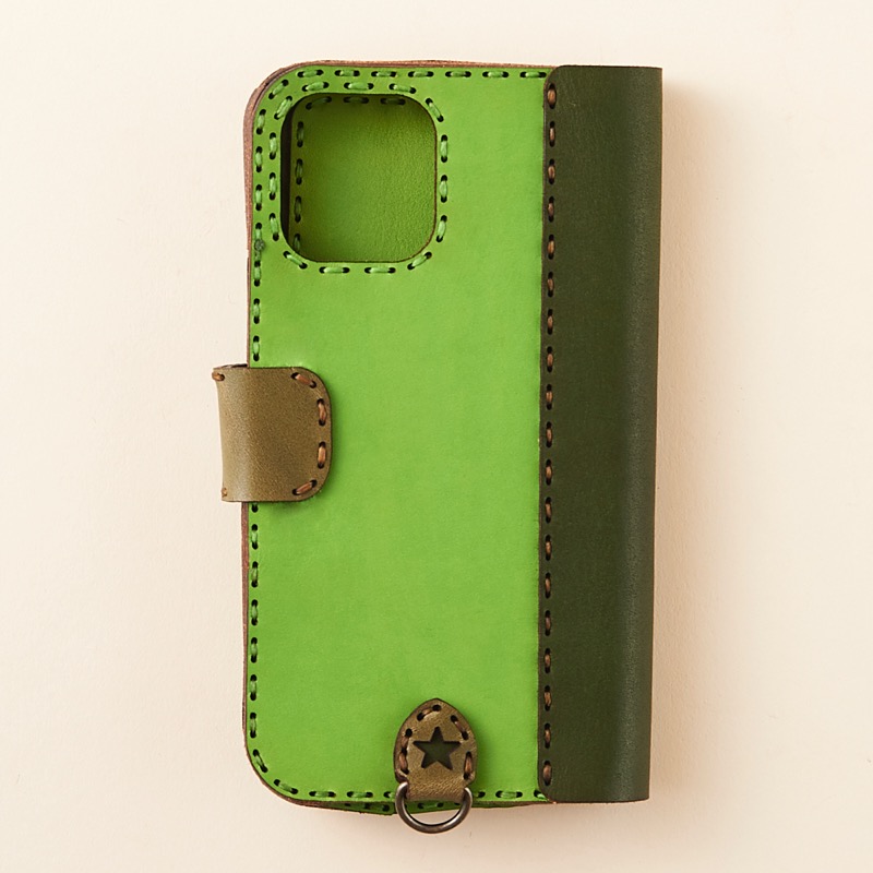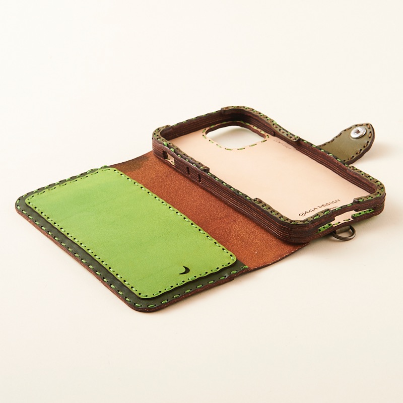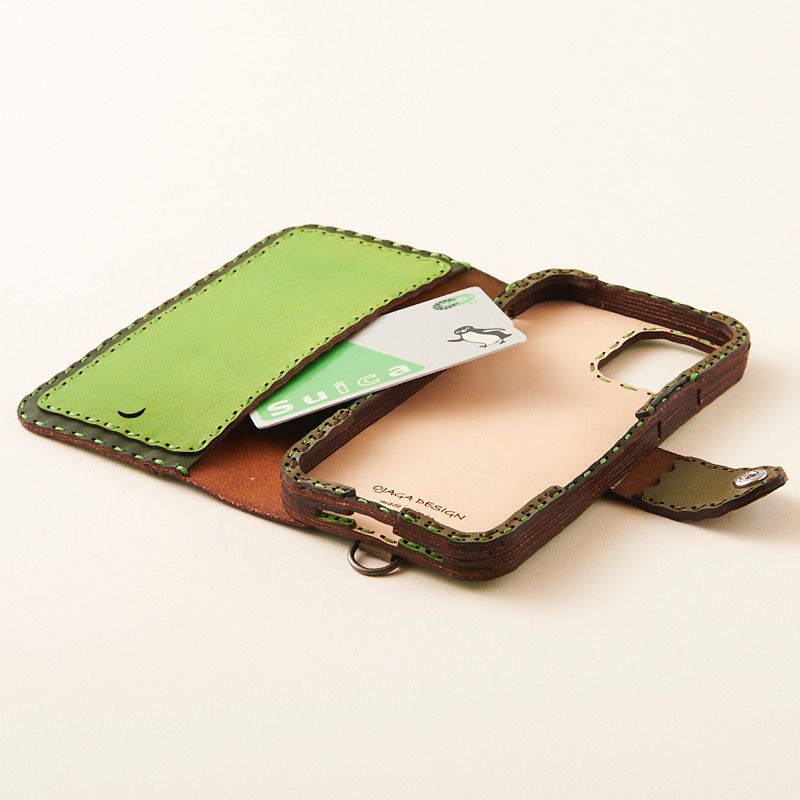 ケース側面をすべてレザーで覆った保護性の高いデザインで、サイドボタンも革の上から操作可能です。