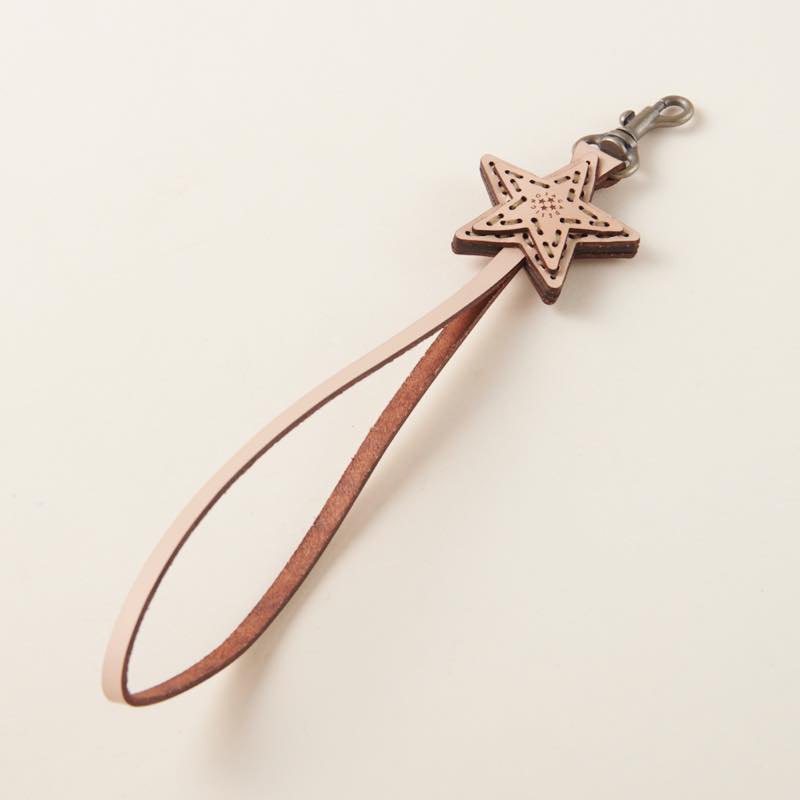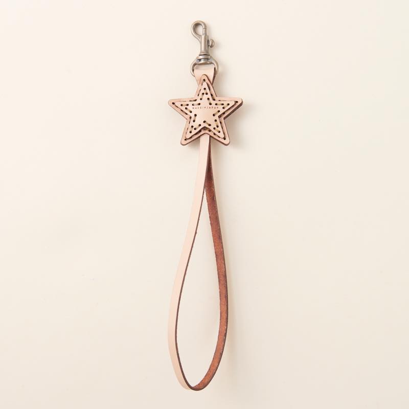 手を通して使うのにちょうどいいレザーハンドストラップです。ワンポイントの五芒星が可愛らしいく、手元にやさしくフィット。使い込む程にレザー特有の艶や質感をお楽しみいただけます。装着が簡単なナスカン仕様となっており、鍵、携帯電話、カメラ、クラッチバッグなど様々なアイテムにお使いいただけ、落下防止ツールとしても役立ちます。