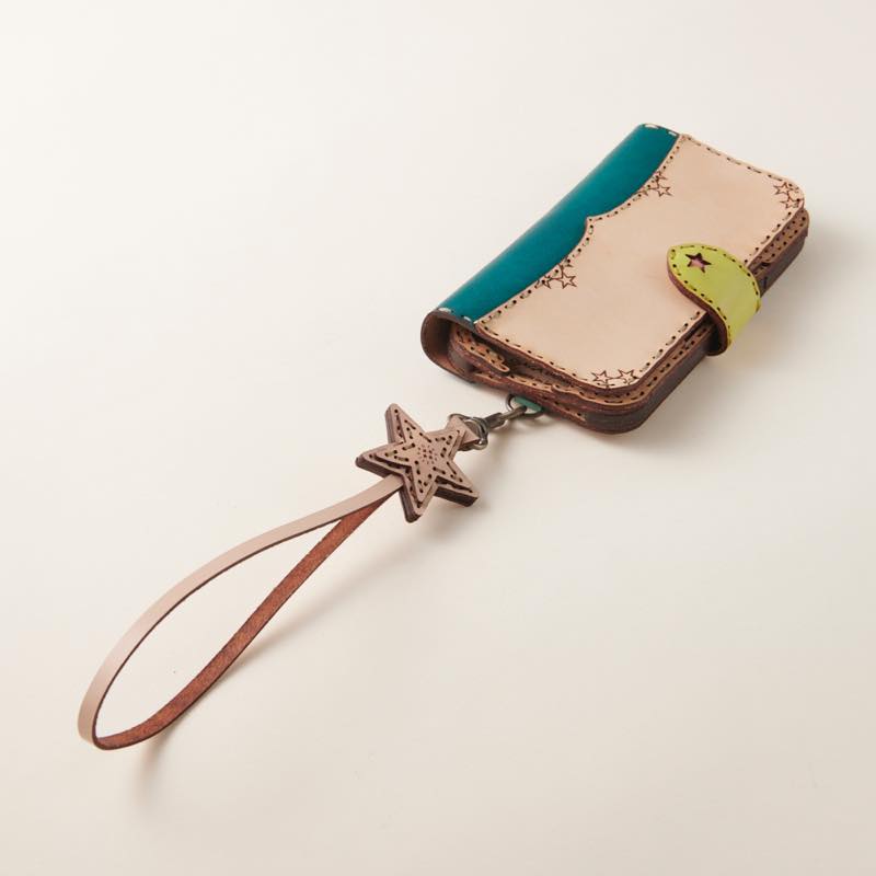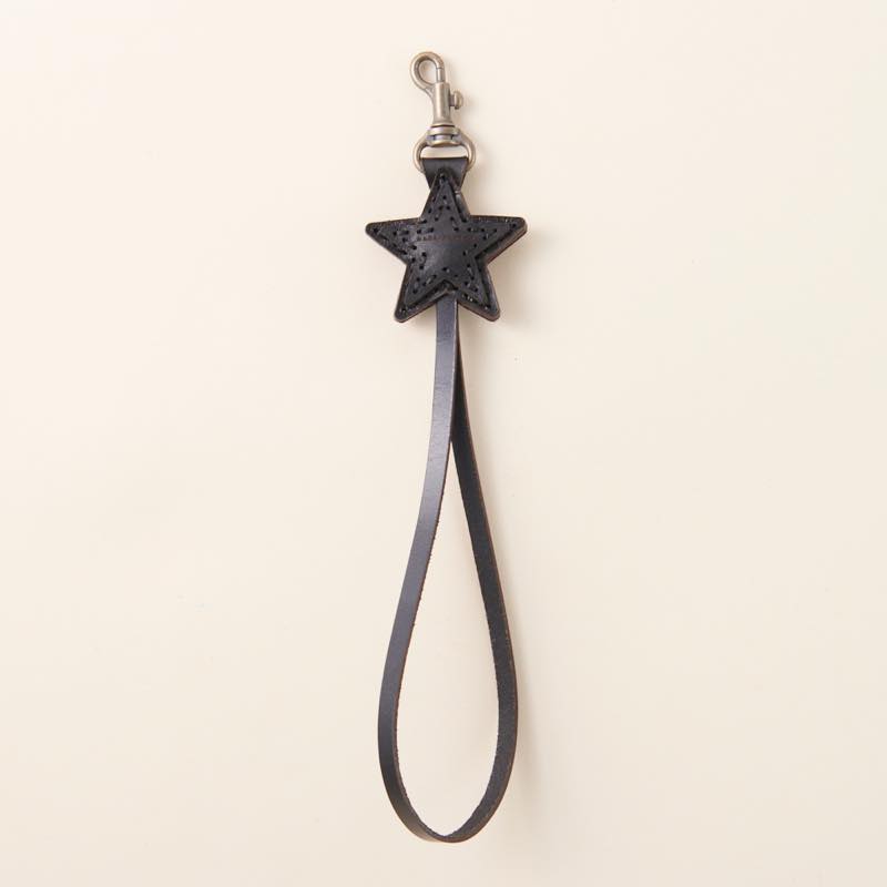 手を通して使うのにちょうどいいレザーハンドストラップです。ワンポイントの五芒星が可愛らしいく、手元にやさしくフィット。使い込む程にレザー特有の艶や質感をお楽しみいただけます。装着が簡単なナスカン仕様となっており、鍵、携帯電話、カメラ、クラッチバッグなど様々なアイテムにお使いいただけ、落下防止ツールとしても役立ちます。