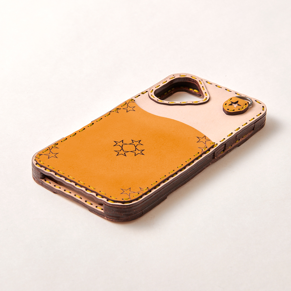 ケース側面をすべてレザーで覆った保護性の高いデザインで、サイドボタンはケースの上から操作可能です。
