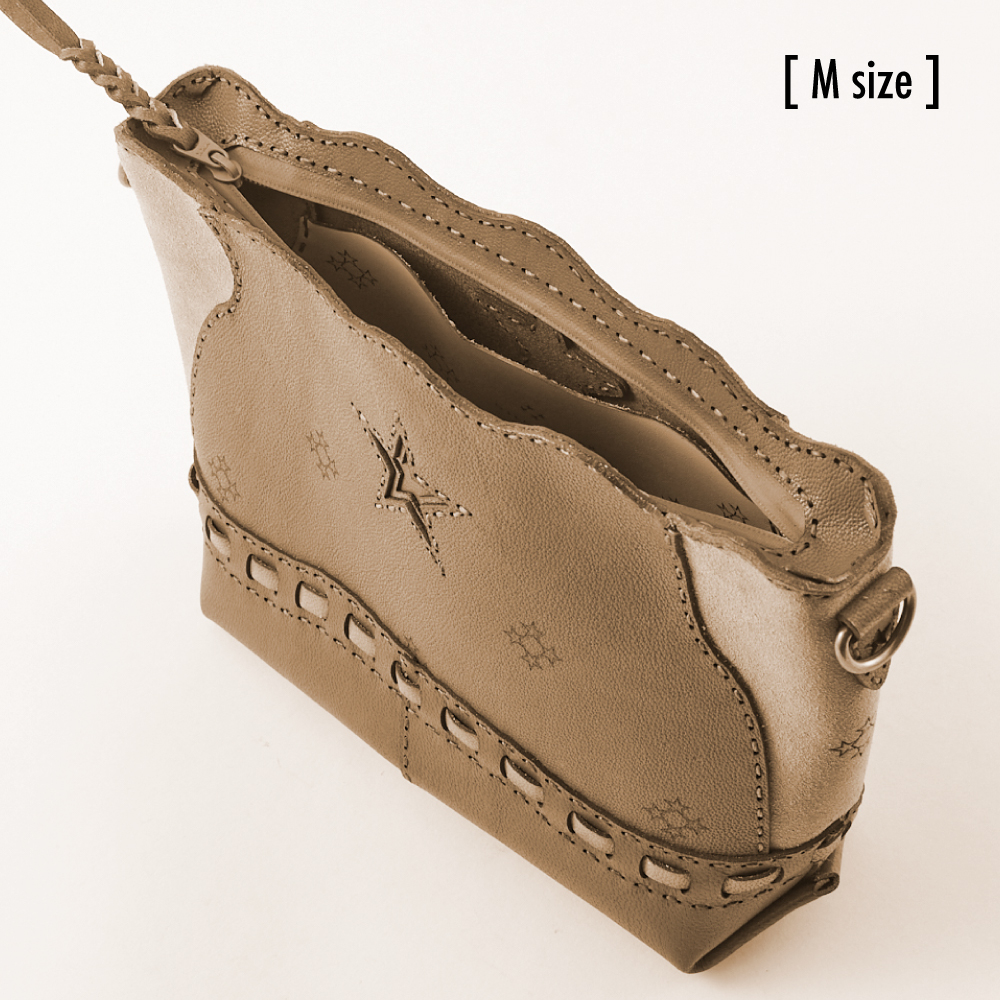 五芒星のマークがポイントのシンプルポーチ [ LINDI ] レザーの質感が楽しめる美しい色合いで、編み込みデザインが個性を引き立てます。別売りのショルダーストラップを使えば、ショルダーバッグとしても楽しめます。 S・Mの2サイズ展開で、シーンに合わせた使い方が可能。デイリーユースから特別な日まで、あなたのスタイルにピッタリのアイテムです。 ぜひ、このエレガントなポーチを手に入れて、毎日のコーディネートをさらに素敵に演出してください.