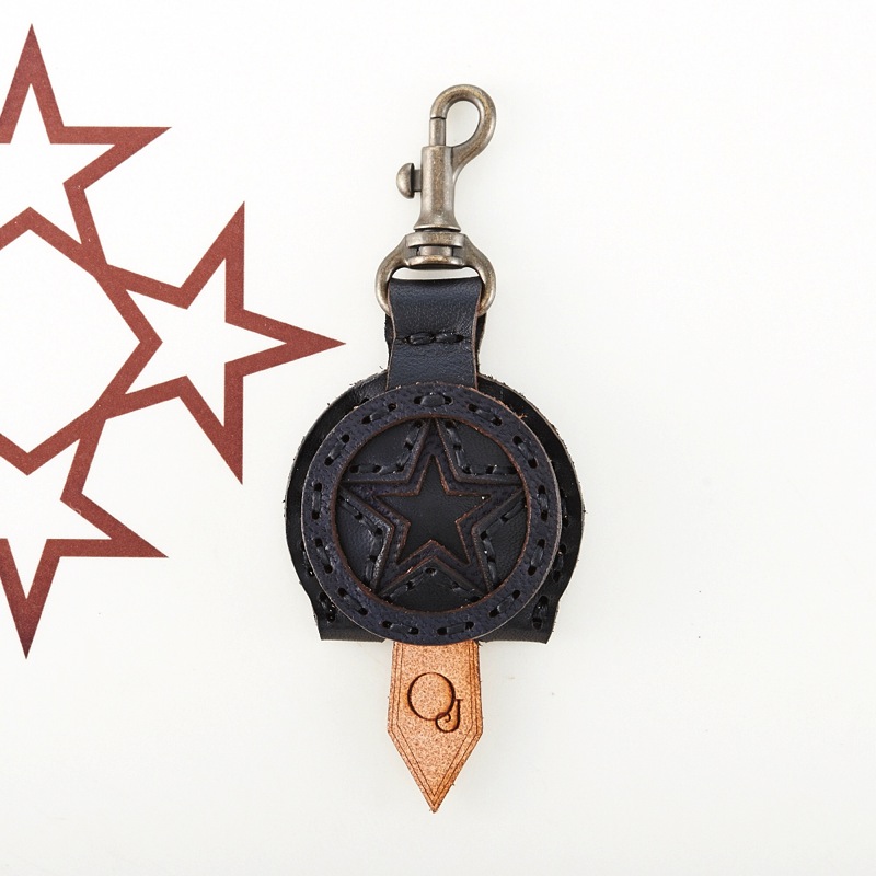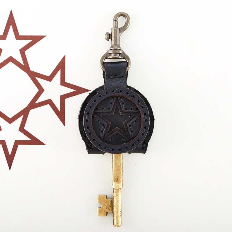 五芒星を表面にデザインしたフラップキーキャップ。カラフルなレザーパーツと刺繍糸を使ったポップなものから、シンンプルでクラシックなカラーリングのものまで豊富なカラーバリエーションとなっています。自分だけのお気に入りのカラーを探しましょう。
