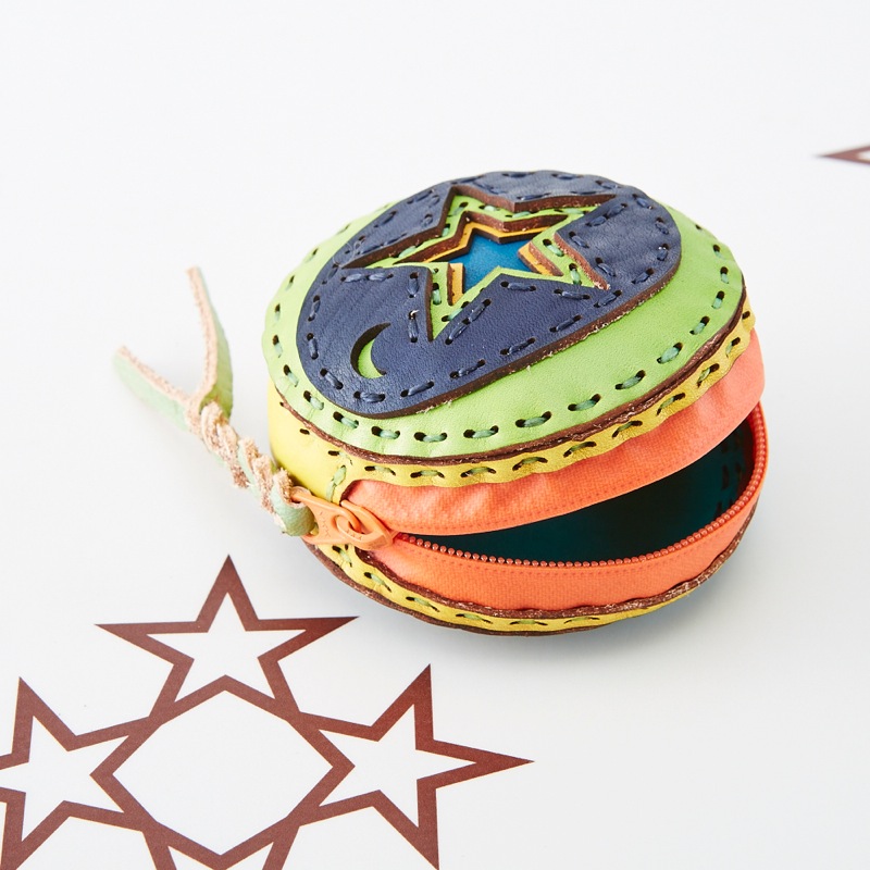 丸いフォルムが印象的な立体感のあるコインケースに、新しいデザインが登場しました。4層のレザーパーツで表現した大きな星の隣に、小さく主張する月がポイントです。ファスナー部分には編み込みされたレザーが付属されているため、使いやすい仕上がりとなりました。コインケースだけでなくミニポーチとしてもお使い頂けます。