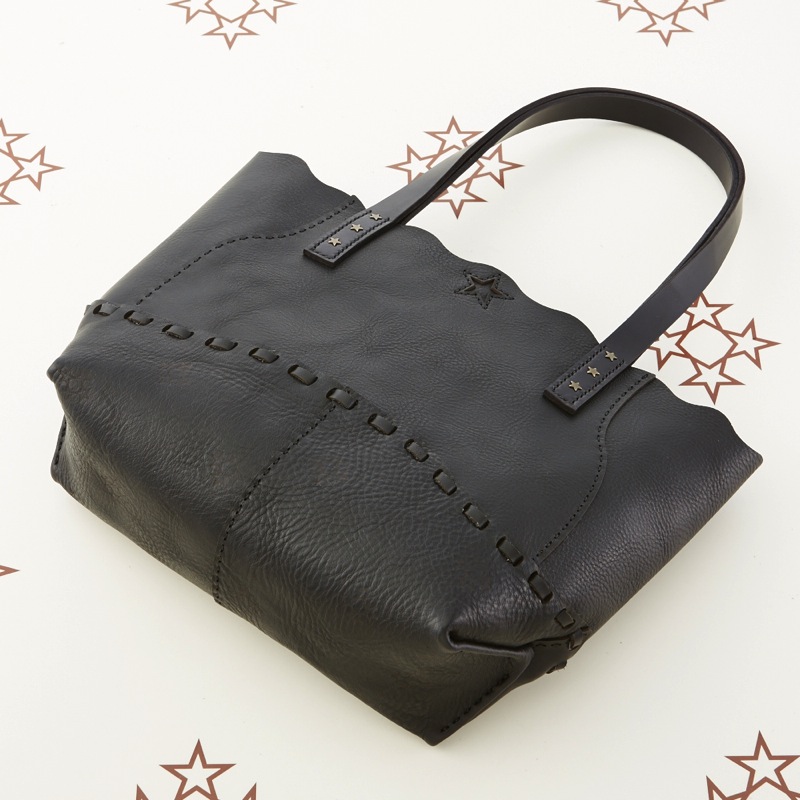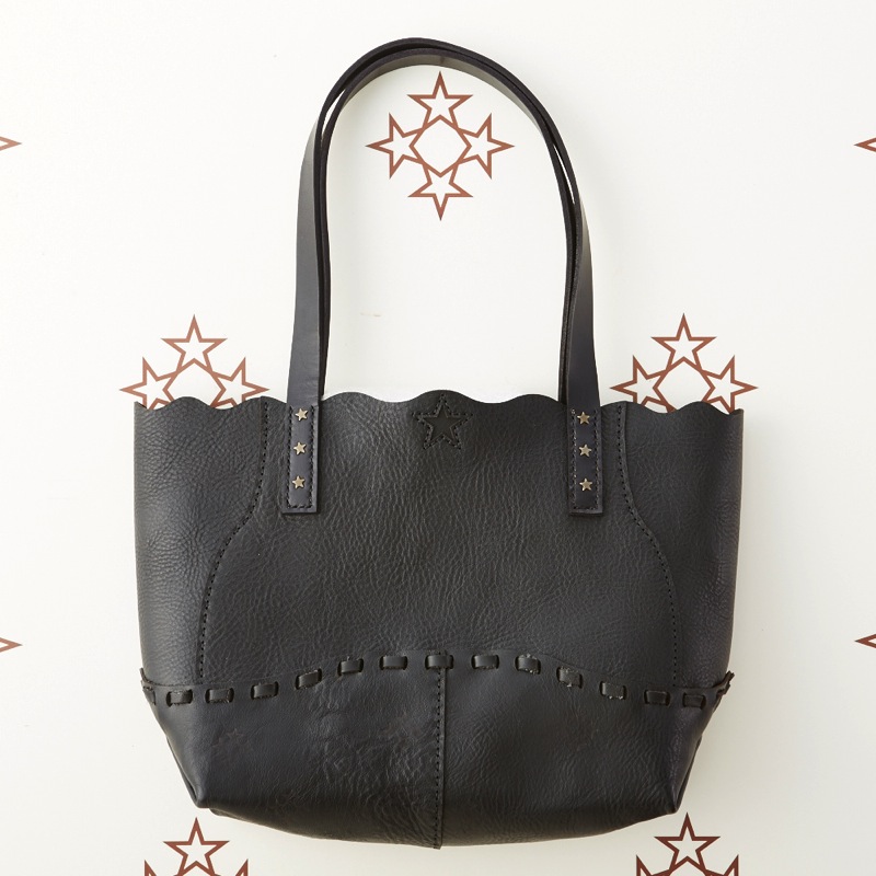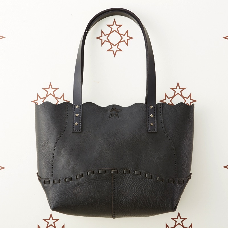 五芒星のマークがアクセントになったシンプルなレザートートです。レザーの質感が楽しめる色合いに仕上がりになりました。軽く持ち運びに富み、荷物がたくさん収納できるサイズも魅力的です。内側にポケットも付き、機能性にも優れております。※こちらの商品は受注生産となっており、発送までに約3週間ほどお時間を頂戴しております。ご確認の上お買い求め下さいませ。