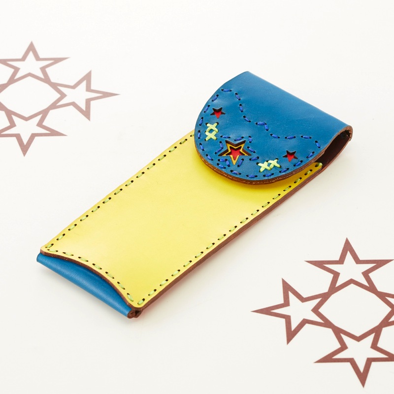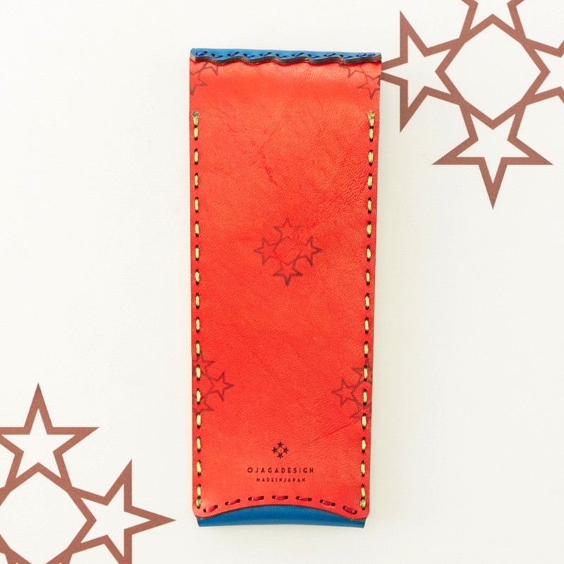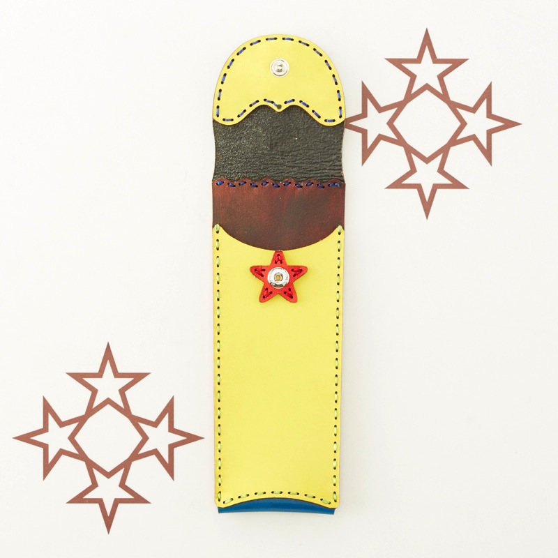 スマートなペンケースです。ペンを3本収納可能なすっきりとした仕上がりは、ビジネスシーンにもおすすめ。レザーを重ねた五芒星とクロスステッチをあしらい、他にはないデザインが魅力的な仕上がりです。ボタン部分の五芒星もポイント。