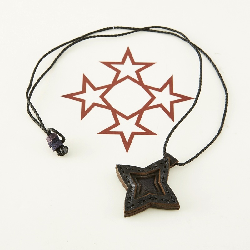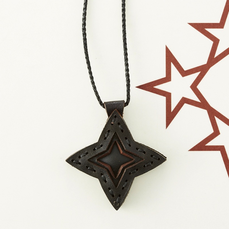 四芒星をデザインしたネックレスです。三枚の革を重ねた存在感のある仕上がりは、ファッションのアクセントに最適です。表裏それぞれ異なったカラーリングなので、リバーシブルでお楽しみ頂けます。紐部分のレザービーズで紐をお好みの長さに調整出来る仕様となっております。