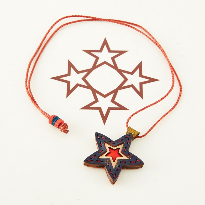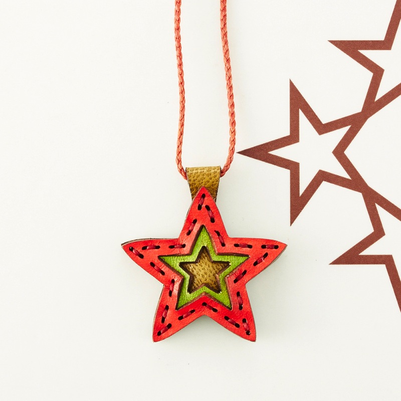 五芒星をデザインしたネックレスです。三枚の革を重ねた存在感のある仕上がりは、ファッションのアクセントに最適です。表裏それぞれ異なったカラーリングなので、リバーシブルでお楽しみ頂けます。紐部分のレザービーズで紐をお好みの長さに調整出来る仕様となっております。
