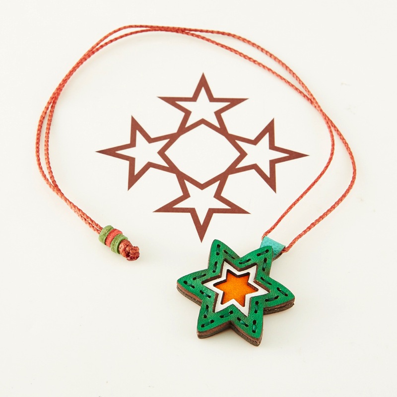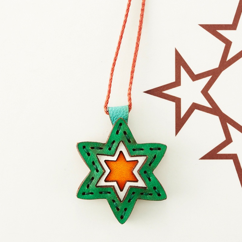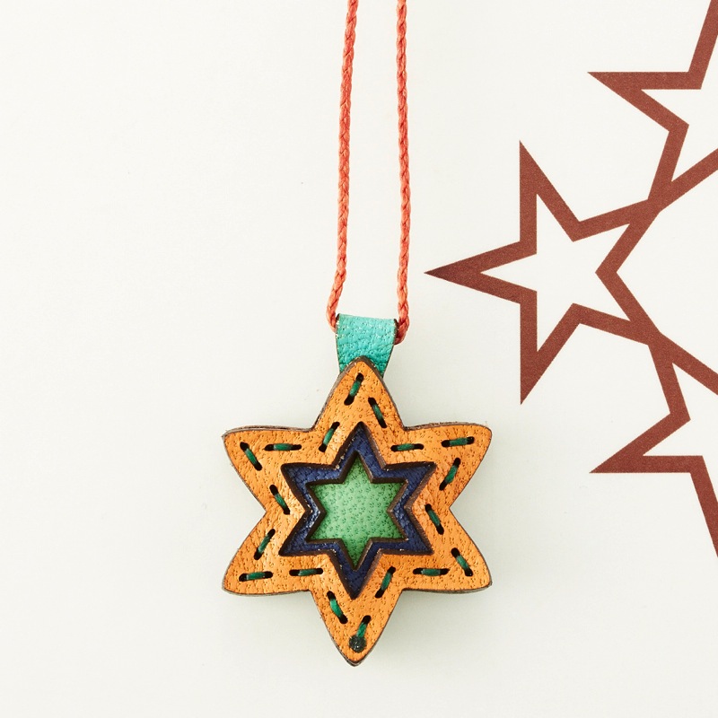 六芒星をデザインしたネックレスです。三枚の革を重ねた存在感のある仕上がりは、ファッションのアクセントに最適です。表裏それぞれ異なったカラーリングなので、リバーシブルでお楽しみ頂けます。紐部分のレザービーズで紐をお好みの長さに調整出来る仕様となっております。