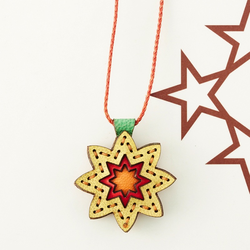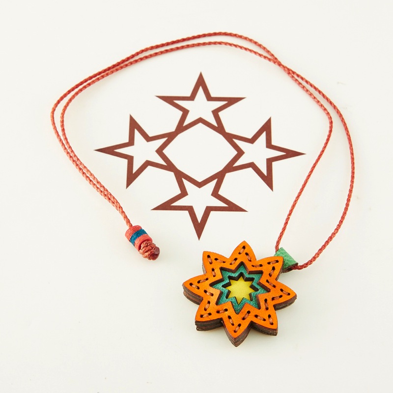 八芒星をデザインしたネックレスです。三枚の革を重ねた存在感のある仕上がりは、ファッションのアクセントに最適です。表裏それぞれ異なったカラーリングなので、リバーシブルでお楽しみ頂けます。紐部分のレザービーズで紐をお好みの長さに調整出来る仕様となっております。