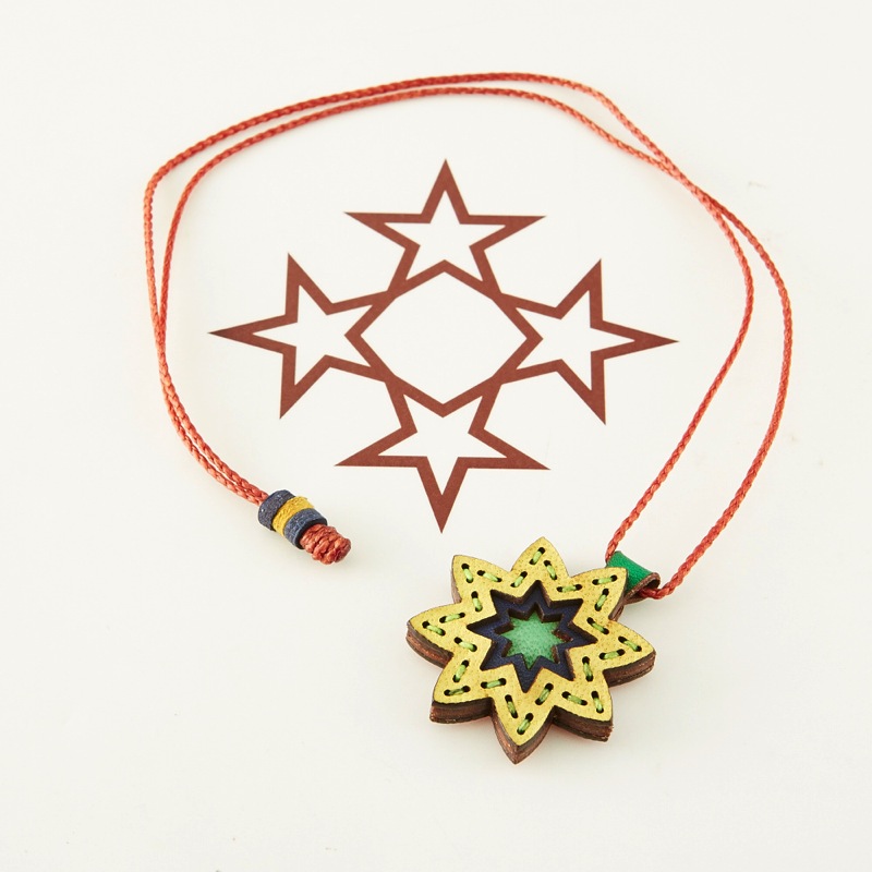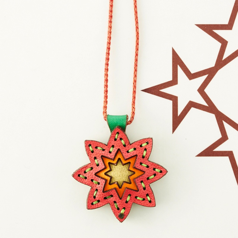 八芒星をデザインしたネックレスです。三枚の革を重ねた存在感のある仕上がりは、ファッションのアクセントに最適です。表裏それぞれ異なったカラーリングなので、リバーシブルでお楽しみ頂けます。紐部分のレザービーズで紐をお好みの長さに調整出来る仕様となっております。
