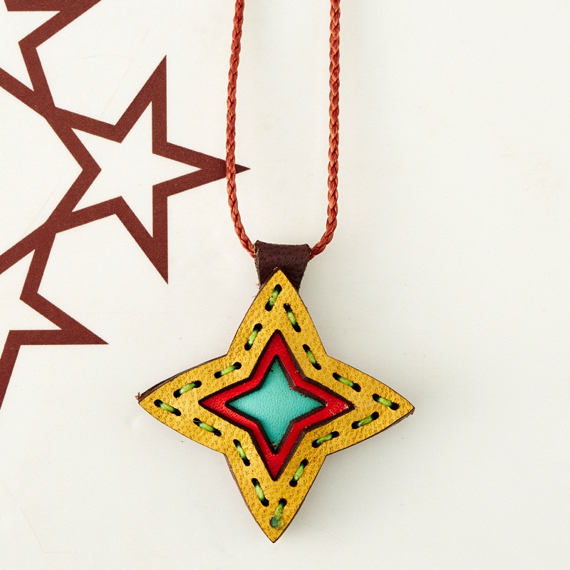 四芒星をデザインしたネックレスです。三枚の革を重ねた存在感のある仕上がりは、ファッションのアクセントに最適です。表裏それぞれ異なったカラーリングなので、リバーシブルでお楽しみ頂けます。紐部分のレザービーズで紐をお好みの長さに調整出来る仕様となっております。