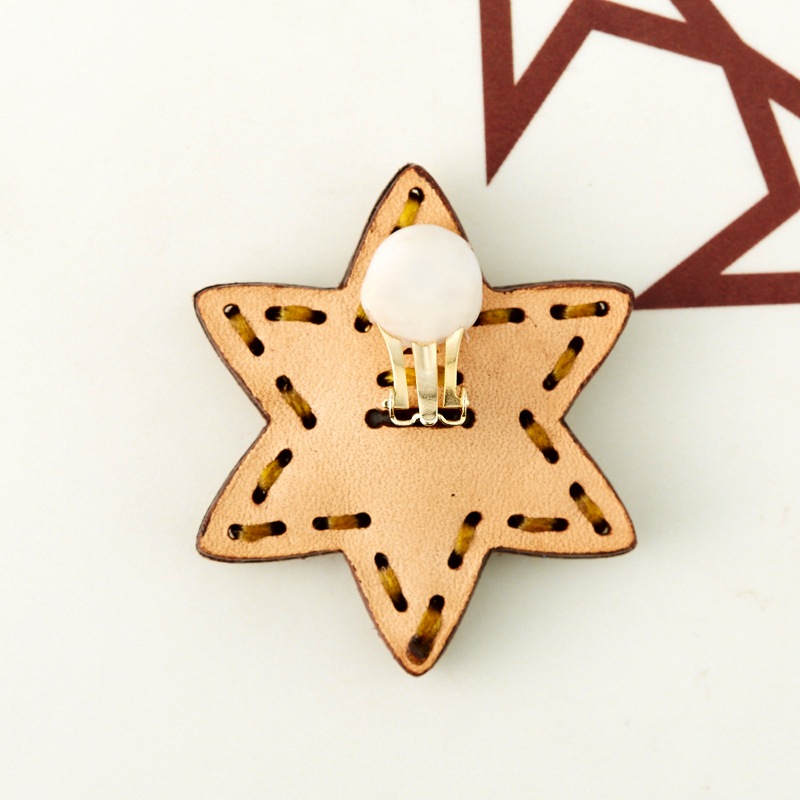 六芒星型の片耳用イヤリングです。三枚の革を重ねた存在感のある仕上がりは、ファッションのアクセントに最適です。耳が痛くなりにくいクリップタイプの金具を使用しております。片耳用なので、左右違ったデザインでのコーディネートもおすすめです。