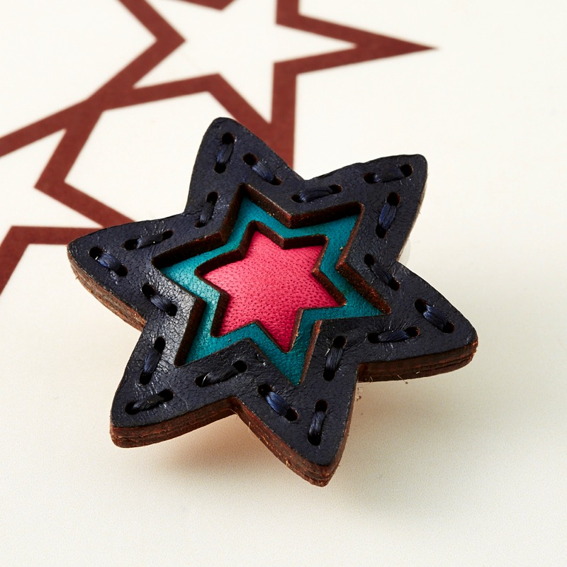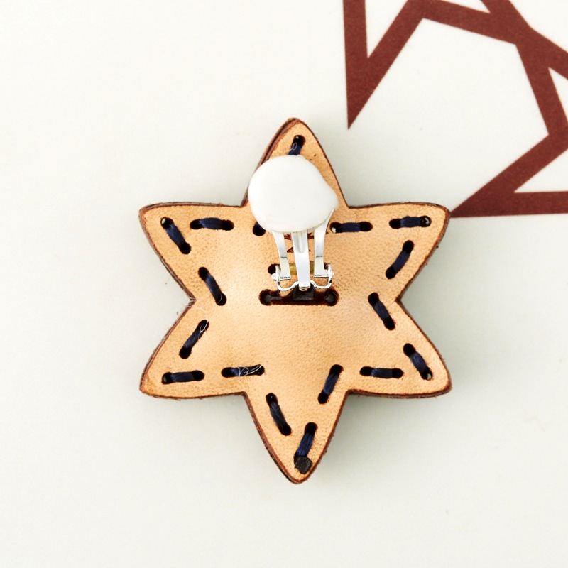 六芒星型の片耳用イヤリングです。三枚の革を重ねた存在感のある仕上がりは、ファッションのアクセントに最適です。耳が痛くなりにくいクリップタイプの金具を使用しております。片耳用なので、左右違ったデザインでのコーディネートもおすすめです。