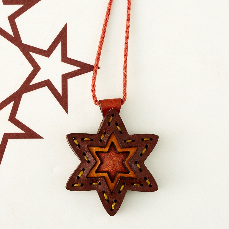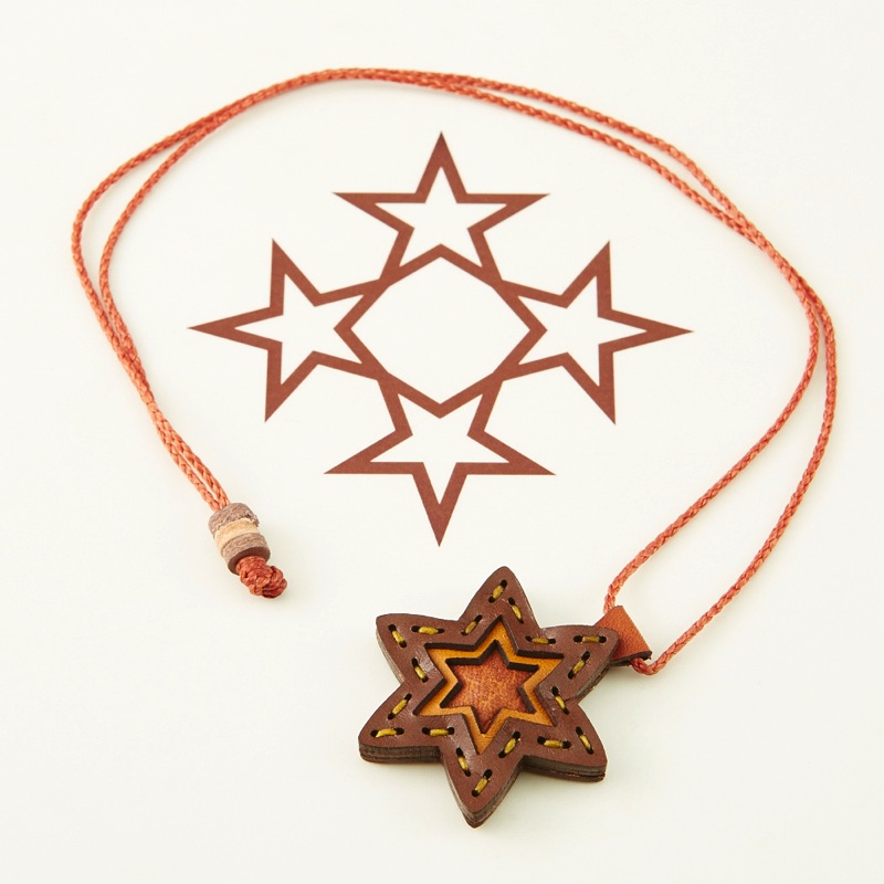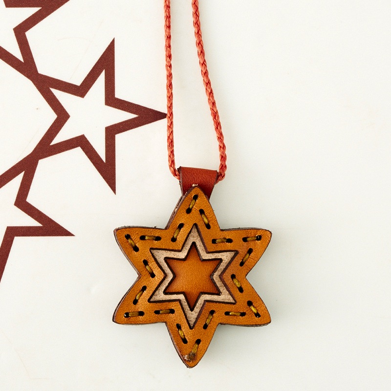 六芒星をデザインしたネックレスです。三枚の革を重ねた存在感のある仕上がりは、ファッションのアクセントに最適です。表裏それぞれ異なったカラーリングなので、リバーシブルでお楽しみ頂けます。紐部分のレザービーズで紐をお好みの長さに調整出来る仕様となっております。