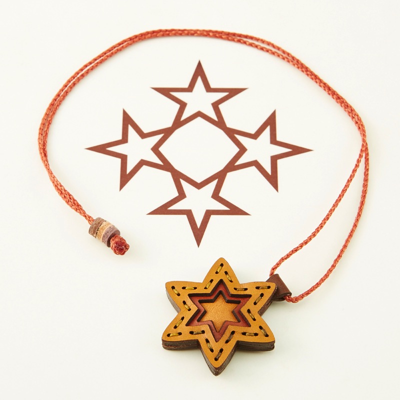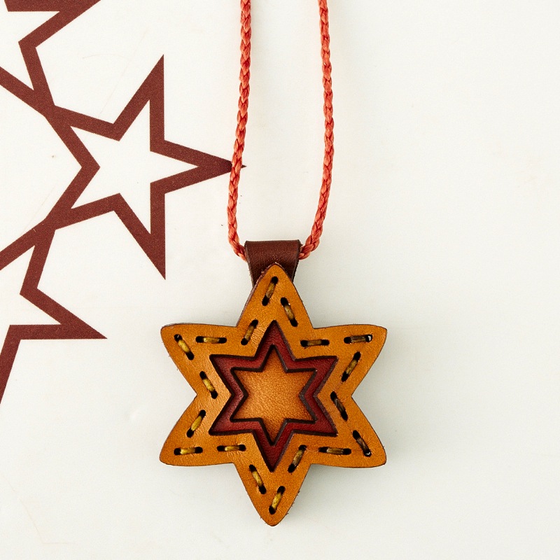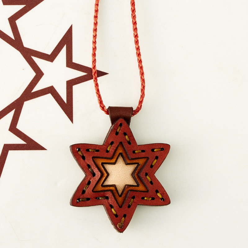六芒星をデザインしたネックレスです。三枚の革を重ねた存在感のある仕上がりは、ファッションのアクセントに最適です。表裏それぞれ異なったカラーリングなので、リバーシブルでお楽しみ頂けます。紐部分のレザービーズで紐をお好みの長さに調整出来る仕様となっております。