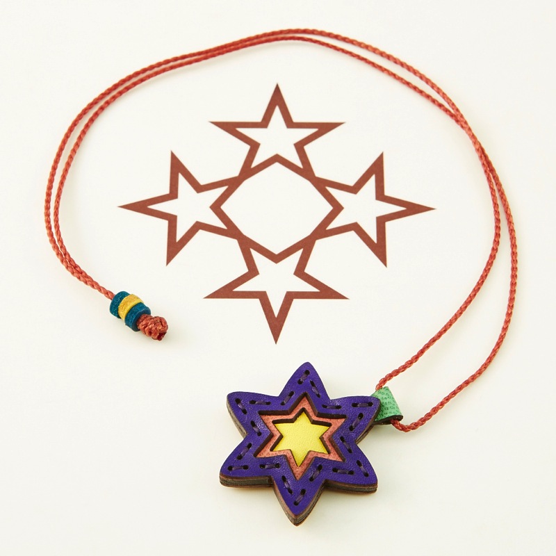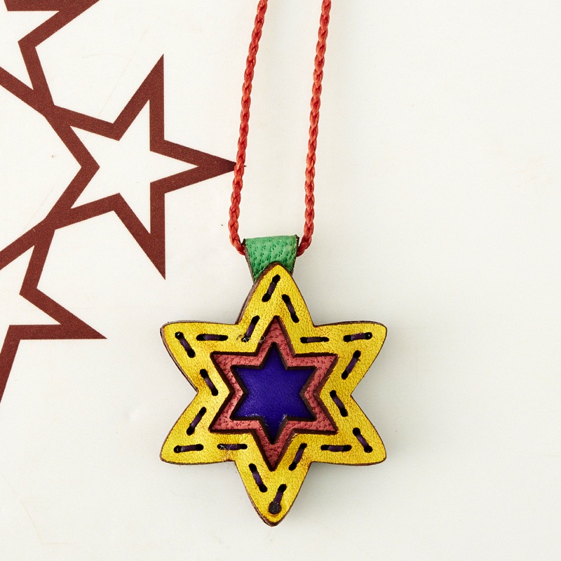 六芒星をデザインしたネックレスです。三枚の革を重ねた存在感のある仕上がりは、ファッションのアクセントに最適です。表裏それぞれ異なったカラーリングなので、リバーシブルでお楽しみ頂けます。紐部分のレザービーズで紐をお好みの長さに調整出来る仕様となっております。