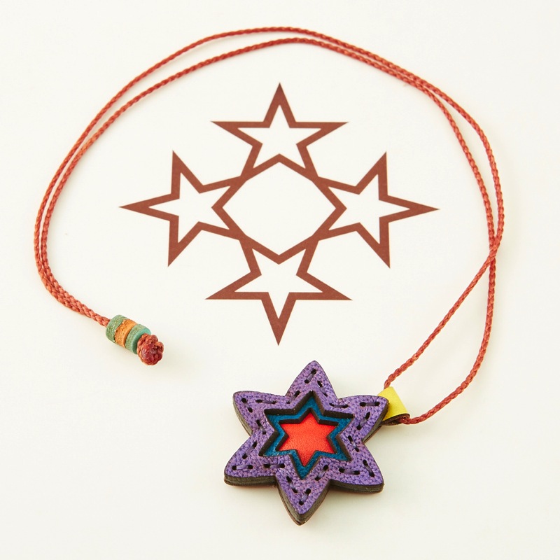 六芒星をデザインしたネックレスです。三枚の革を重ねた存在感のある仕上がりは、ファッションのアクセントに最適です。表裏それぞれ異なったカラーリングなので、リバーシブルでお楽しみ頂けます。紐部分のレザービーズで紐をお好みの長さに調整出来る仕様となっております。