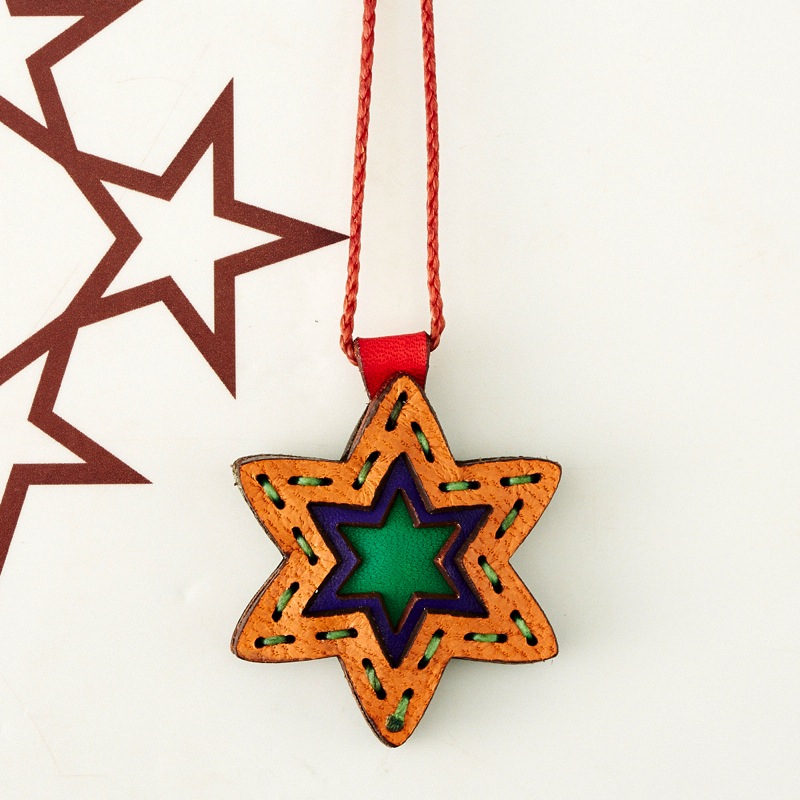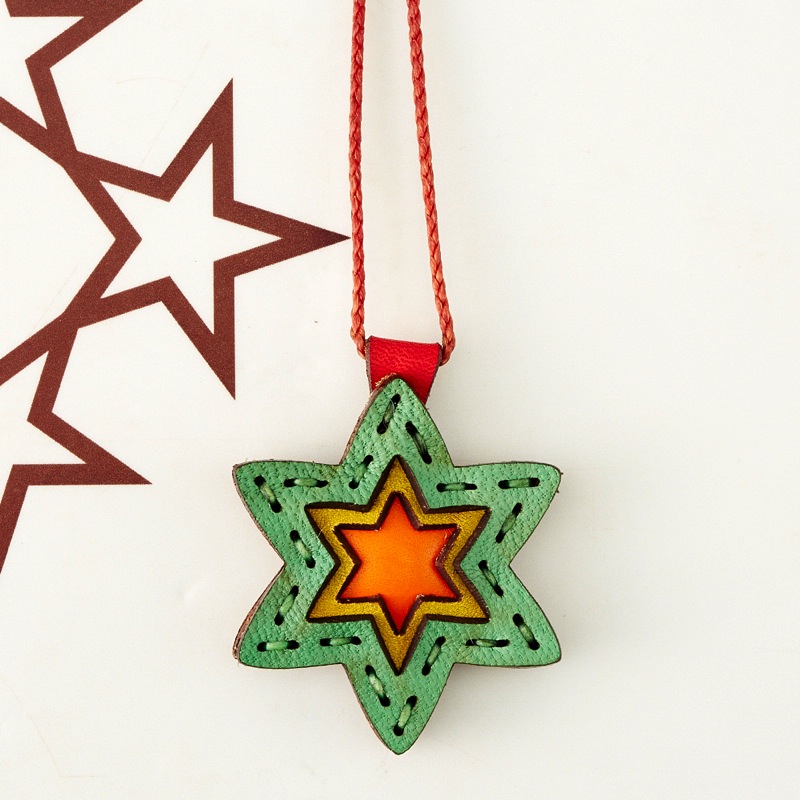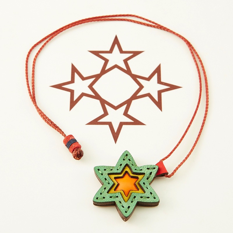 六芒星をデザインしたネックレスです。三枚の革を重ねた存在感のある仕上がりは、ファッションのアクセントに最適です。表裏それぞれ異なったカラーリングなので、リバーシブルでお楽しみ頂けます。紐部分のレザービーズで紐をお好みの長さに調整出来る仕様となっております。
