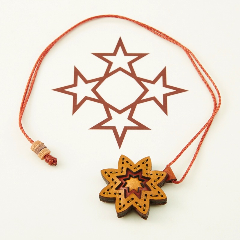 八芒星をデザインしたネックレスです。三枚の革を重ねた存在感のある仕上がりは、ファッションのアクセントに最適です。表裏それぞれ異なったカラーリングなので、リバーシブルでお楽しみ頂けます。紐部分のレザービーズで紐をお好みの長さに調整出来る仕様となっております。