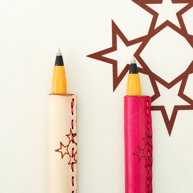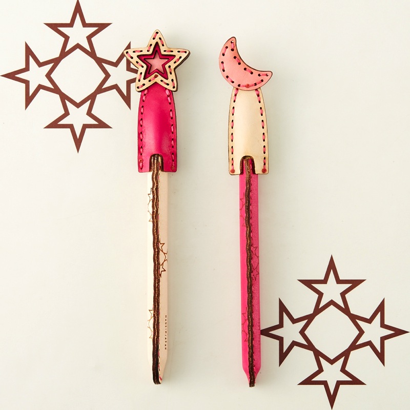 月星モチーフのペンカバーです。よく使うペンをおしゃれに彩ることが出来る、遊び心が溢れるアイテム。レザー本来の質感を手で楽しめ、使い込むごとに革が手に馴染むので持ちやすさがアップします。2本セットなので、ご友人やご家族とのシェアもおすすめ。最大径Φ13.7mm/全長149mmのペンが入るサイズです。