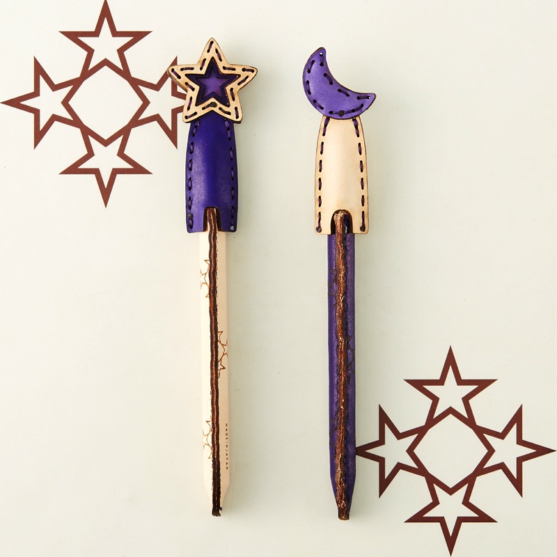 月星モチーフのペンカバーです。よく使うペンをおしゃれに彩ることが出来る、遊び心が溢れるアイテム。レザー本来の質感を手で楽しめ、使い込むごとに革が手に馴染むので持ちやすさがアップします。2本セットなので、ご友人やご家族とのシェアもおすすめ。最大径Φ13.7mm/全長149mmのペンが入るサイズです。