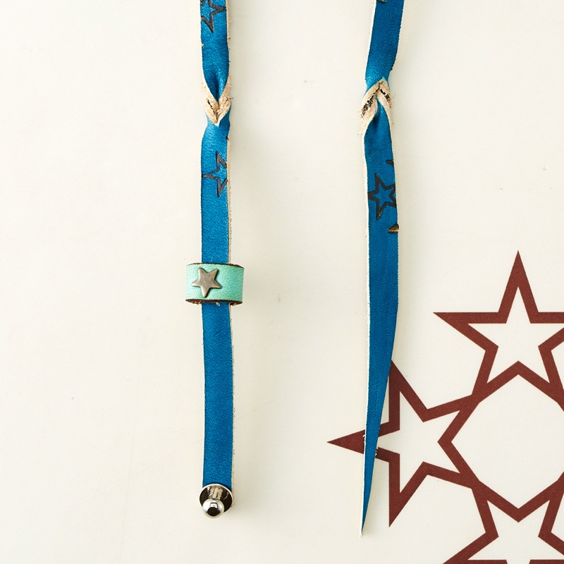 発色の良いレザーにオジャガスターの焼き印を施し、さりげない星スタッズがワンポイントになった二重巻きタイプのブレスレット。