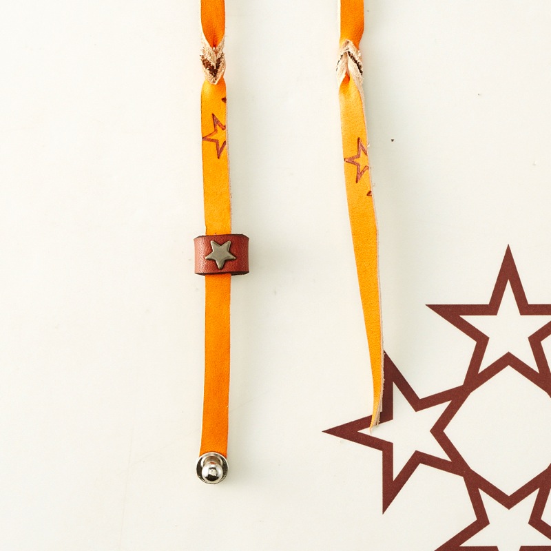 発色の良いレザーにオジャガスターの焼き印を施し、さりげない星スタッズがワンポイントになった二重巻きタイプのブレスレット。